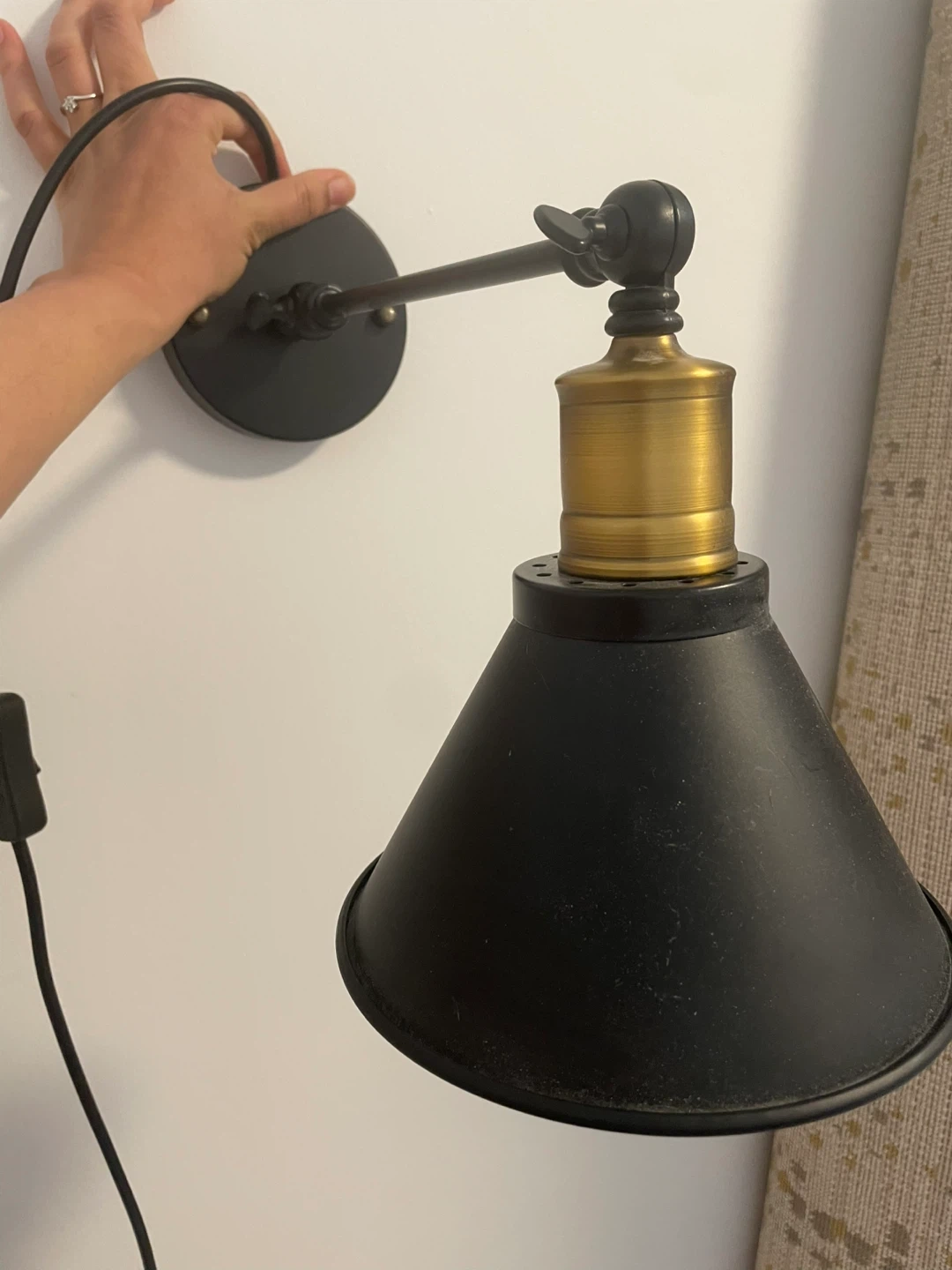 Adjustable plug-in wall sconce with a black metal cone shade and brass accents. It has a pivoting arm for easy adjustment. Can be hardwired or just mounted with a screw.