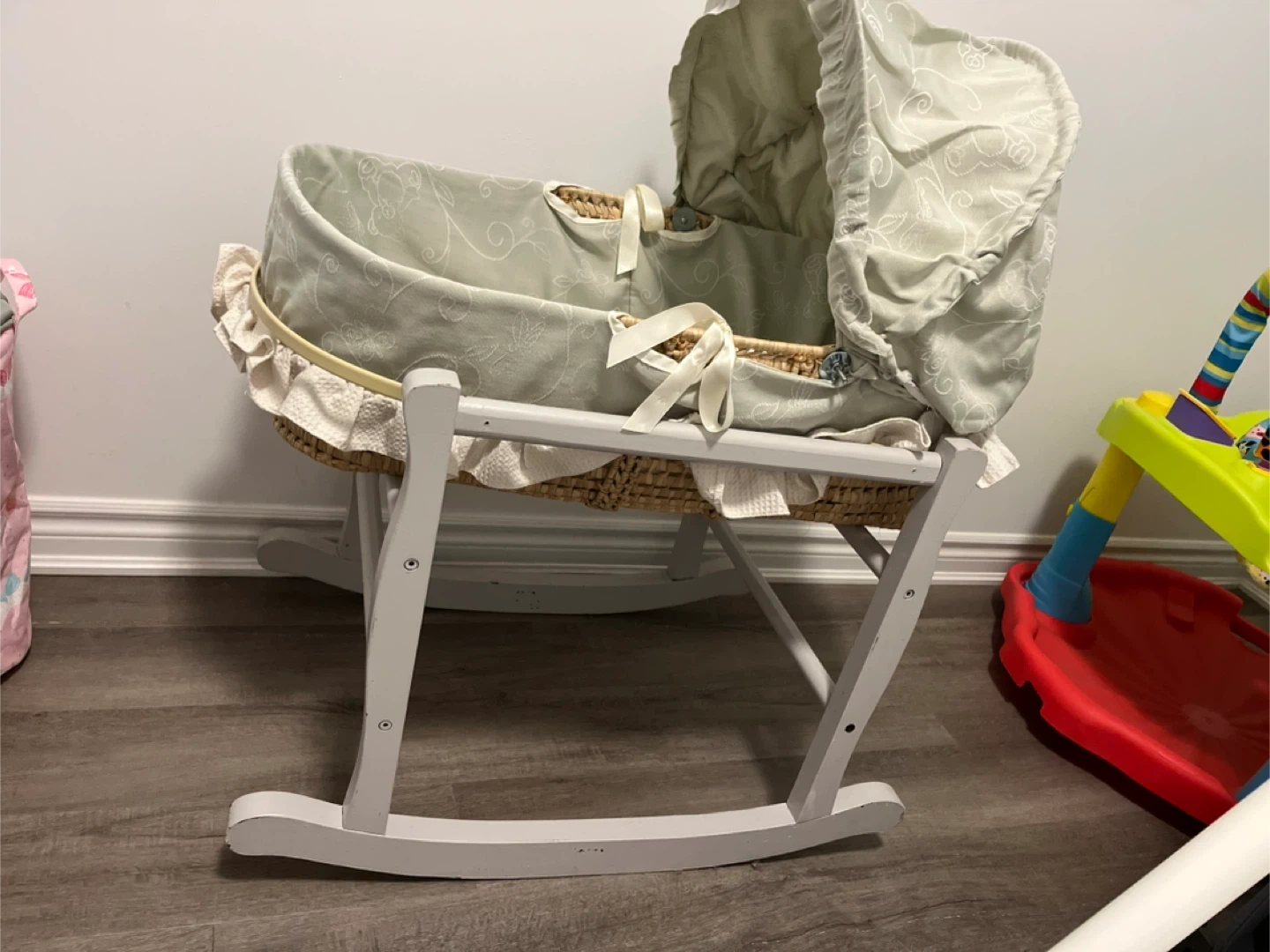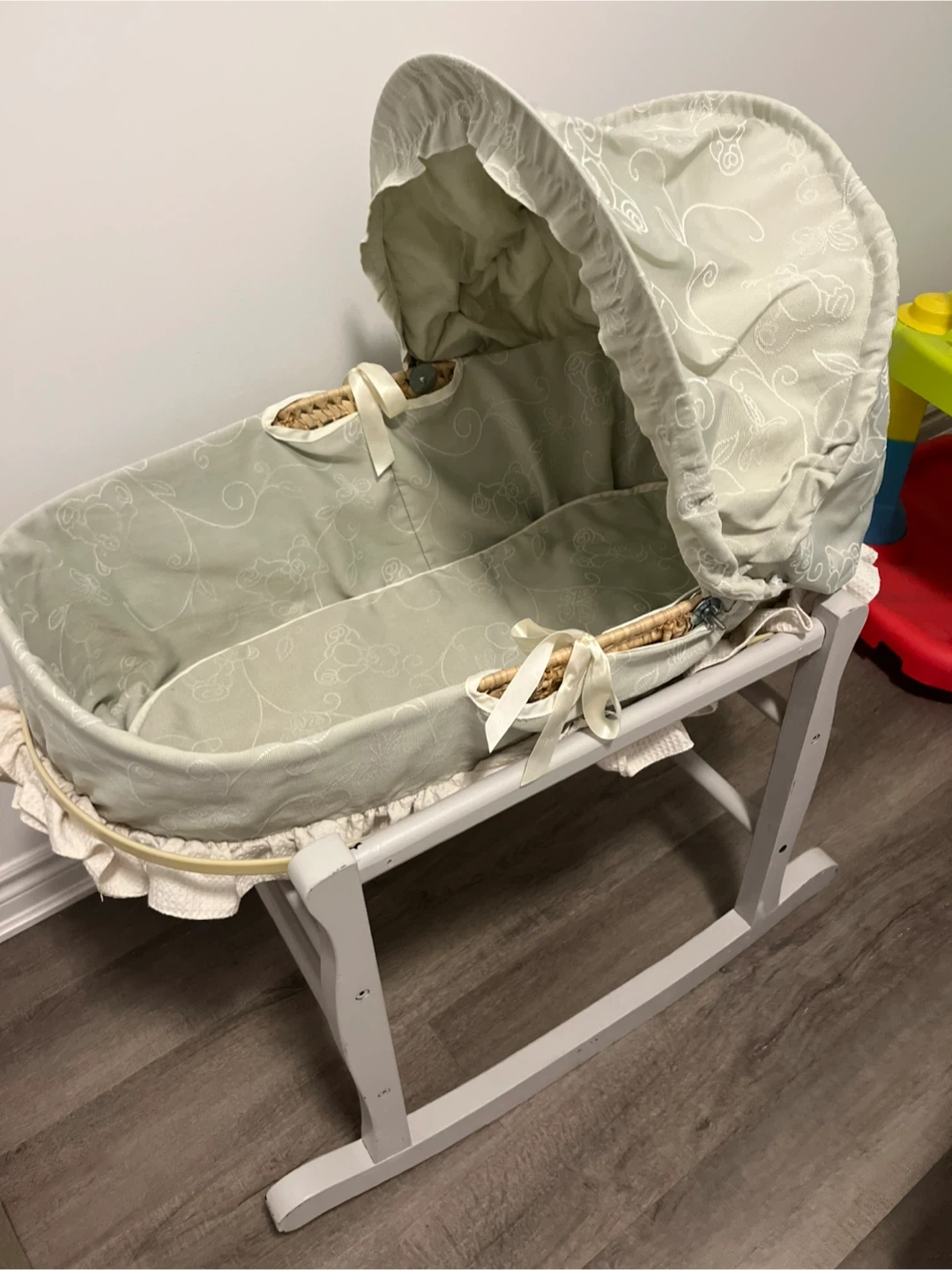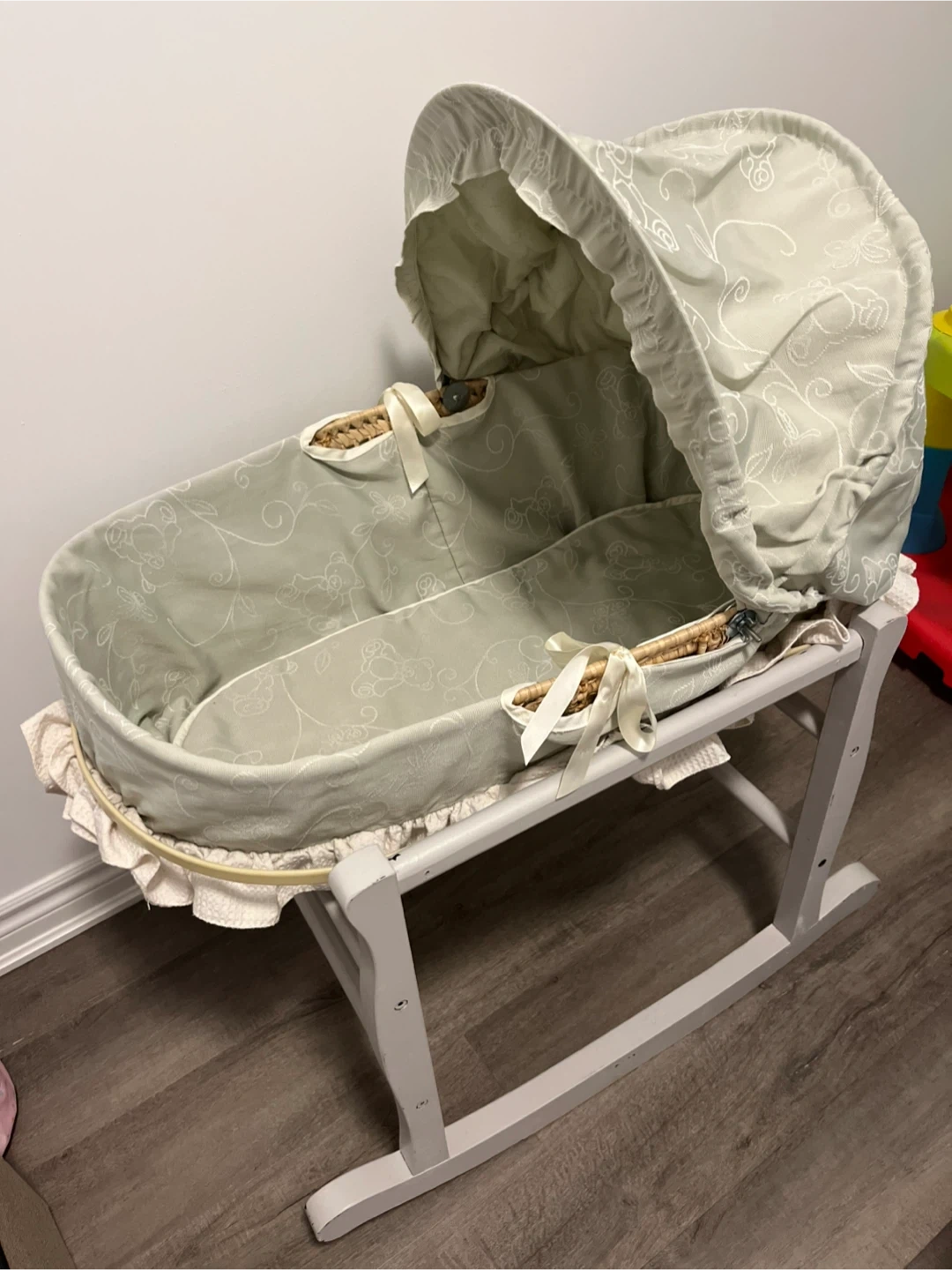 This sweet bassinet comes with a rocking stand. It's lined with a soft, patterned fabric and has ruffled trim. Perfect for a newborn's nursery!
