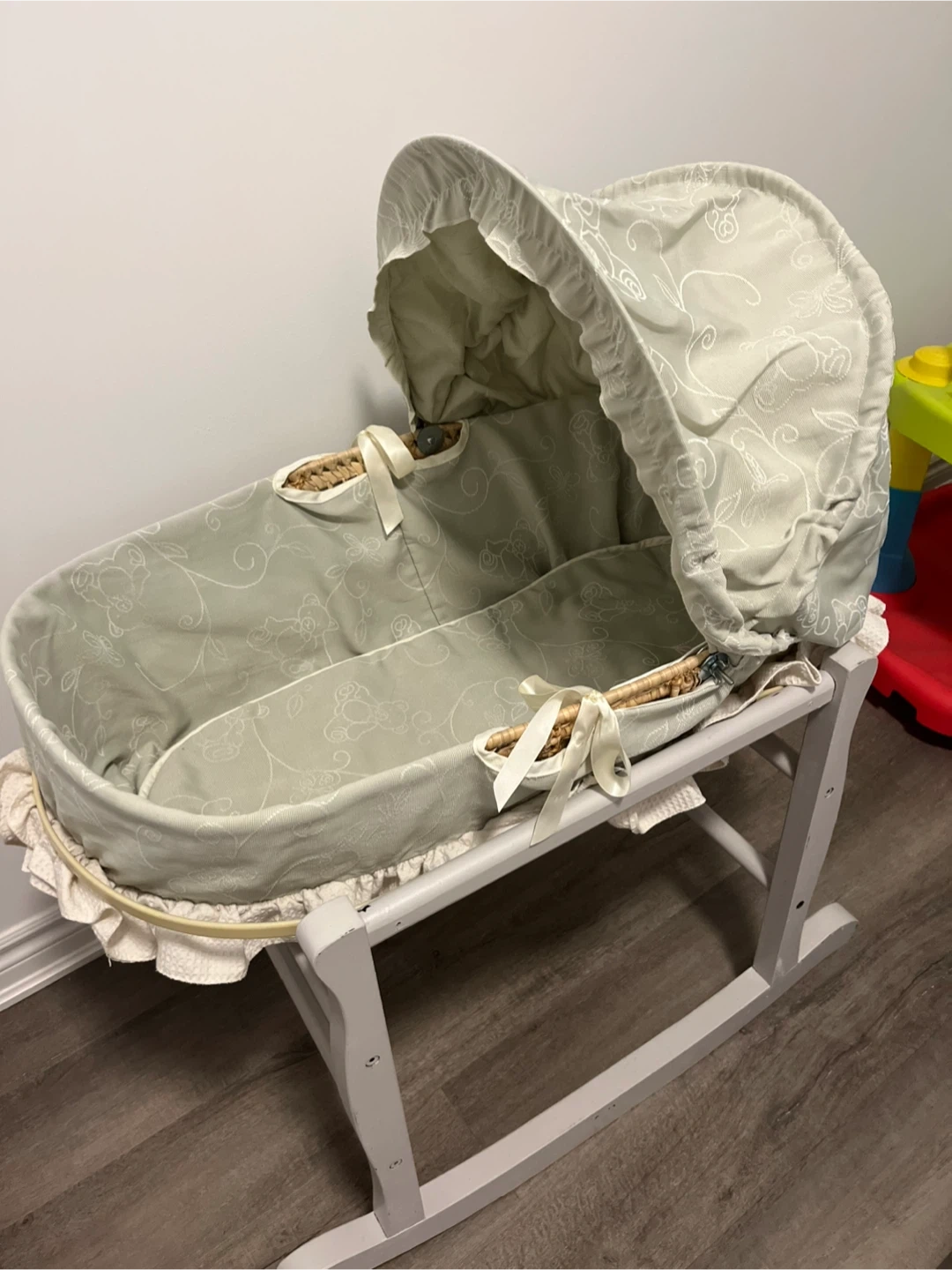 This sweet bassinet comes with a rocking stand. It's lined with a soft, patterned fabric and has ruffled trim. Perfect for a newborn's nursery!