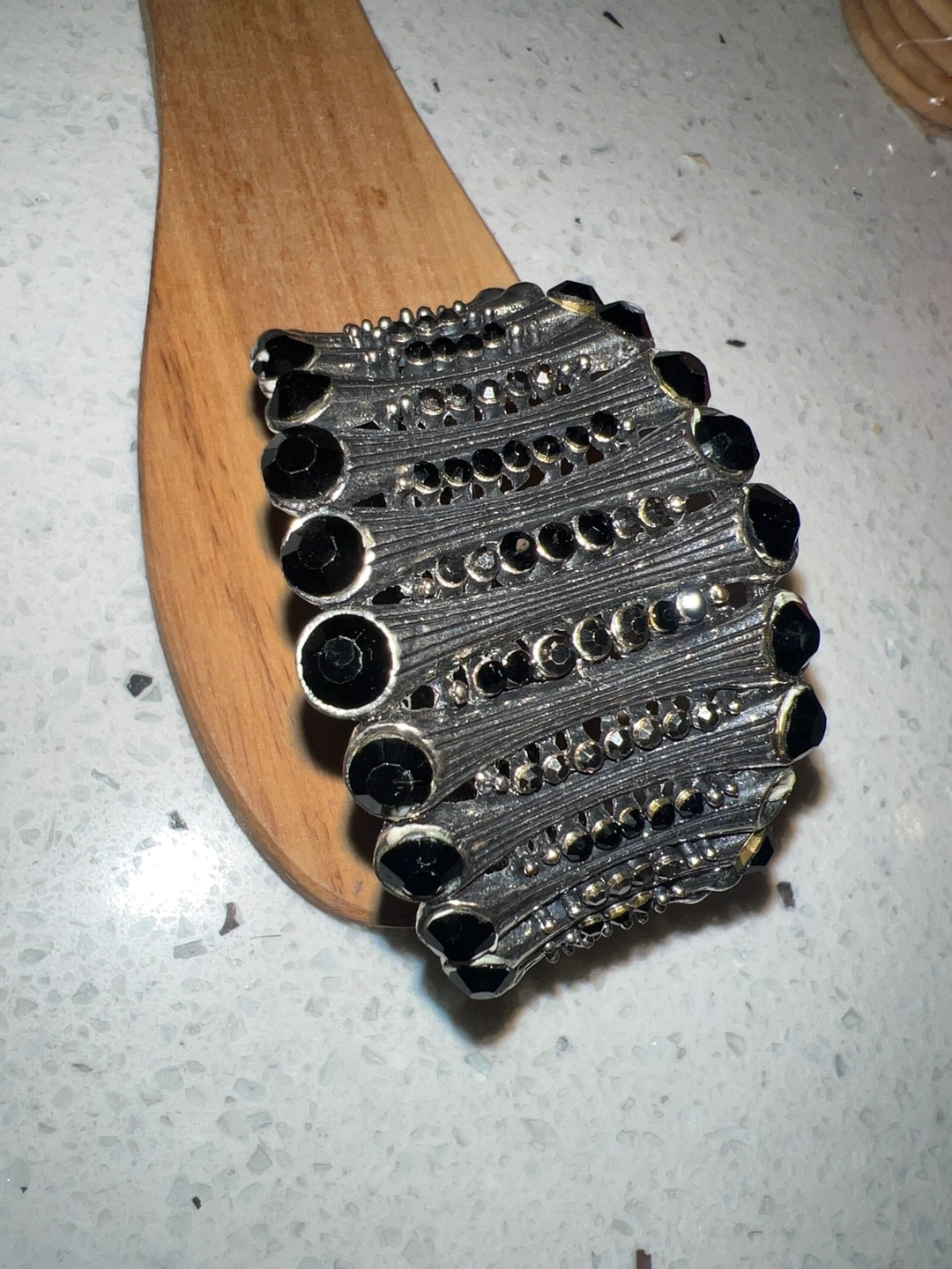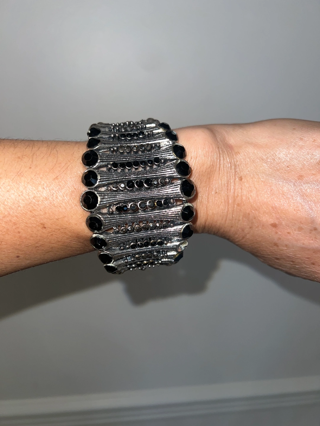 A black and silver statement bracelet with black stones. The bracelet is elastic and can be stretched to fit a variety of wrist sizes.