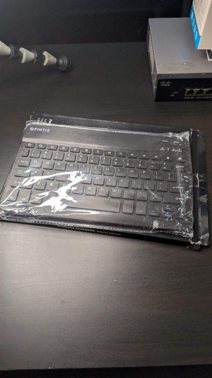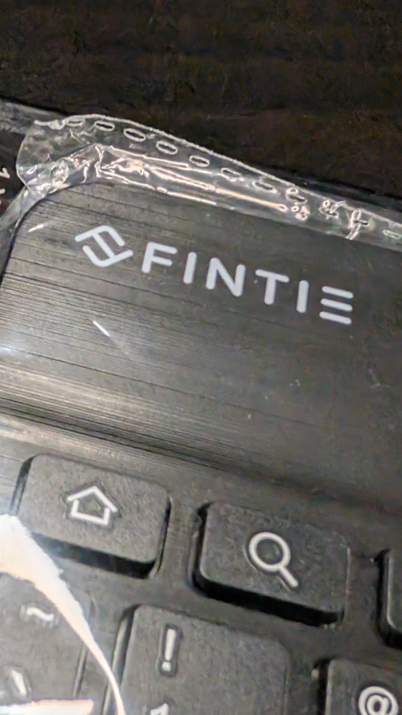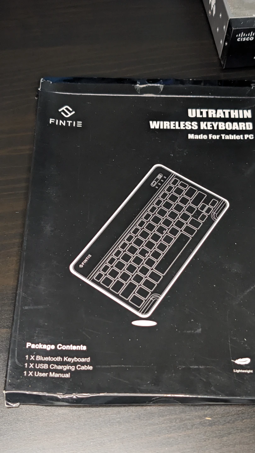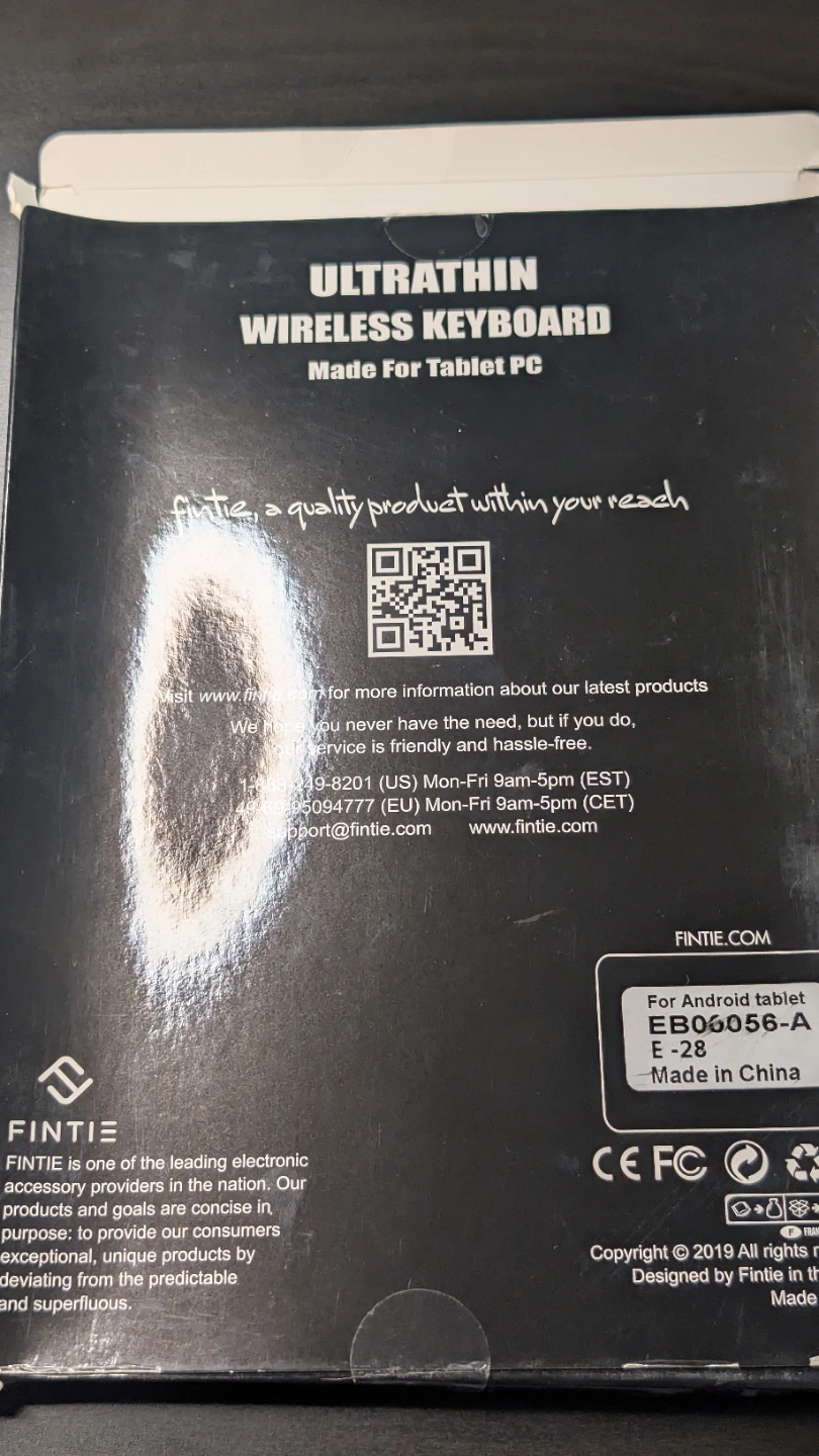 This is an ultrathin wireless keyboard by Fintie, made for tablet PCs. It's black and includes a Bluetooth keyboard, USB charging cable, and a user manual. It's designed to be lightweight and portable.