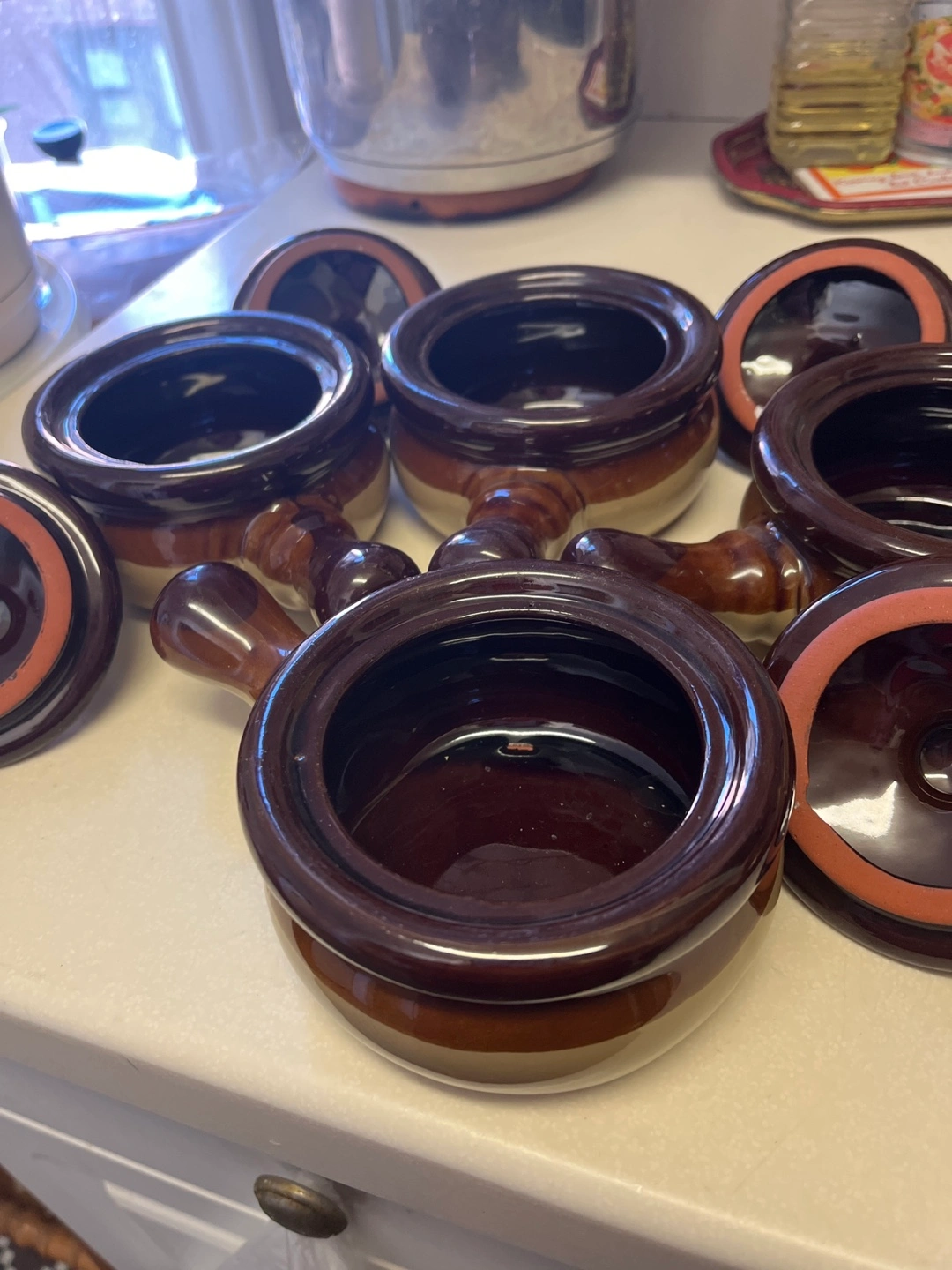 Four small ceramic soup crocks. Brown and tan glaze. Each crock includes a lid and a handle. Perfect for individual portions of soup, chili, or other dishes. Vintage.