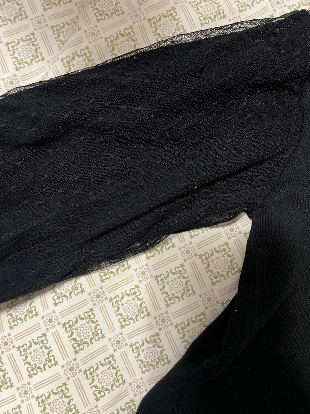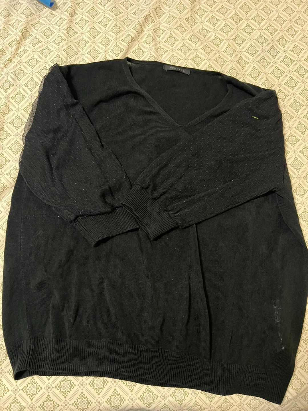 MUMU & Co. black sweater with a V-neckline. It features sheer tulle sleeves with a subtle dot pattern. This top offers a lovely textured detail.