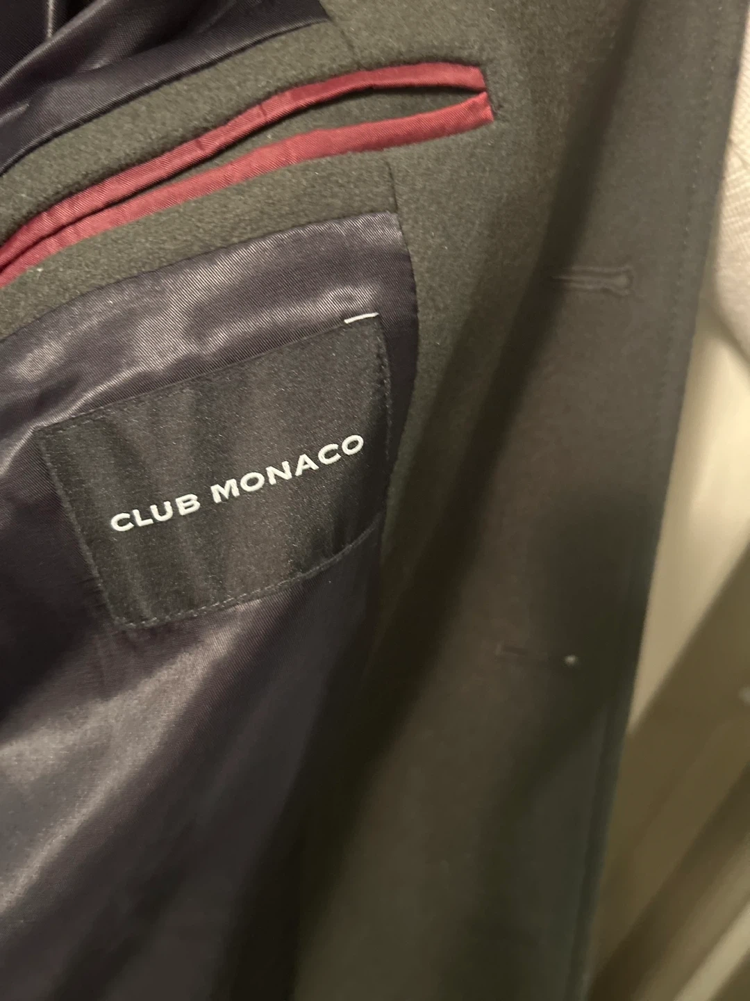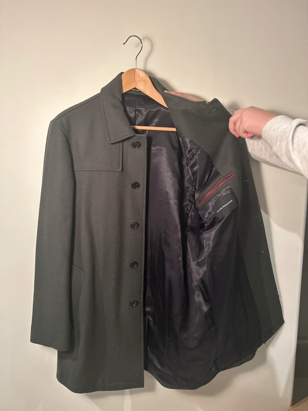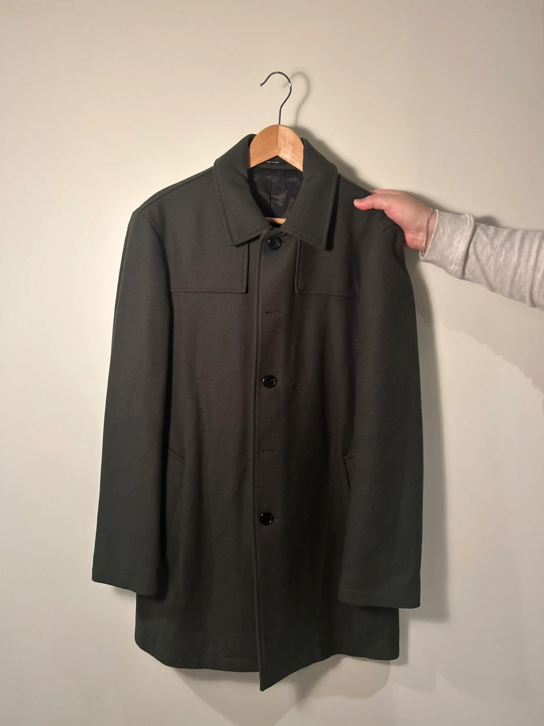 Selling a Club Monaco overcoat in great condition! It's a stylish wool blend perfect for the colder weather. The colour is a dark olive green. A great addition to any wardrobe!