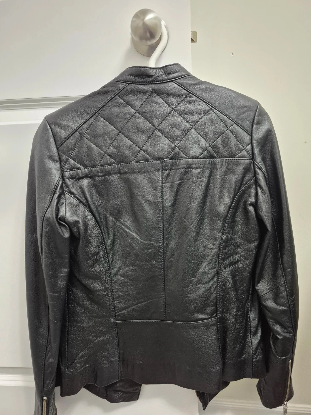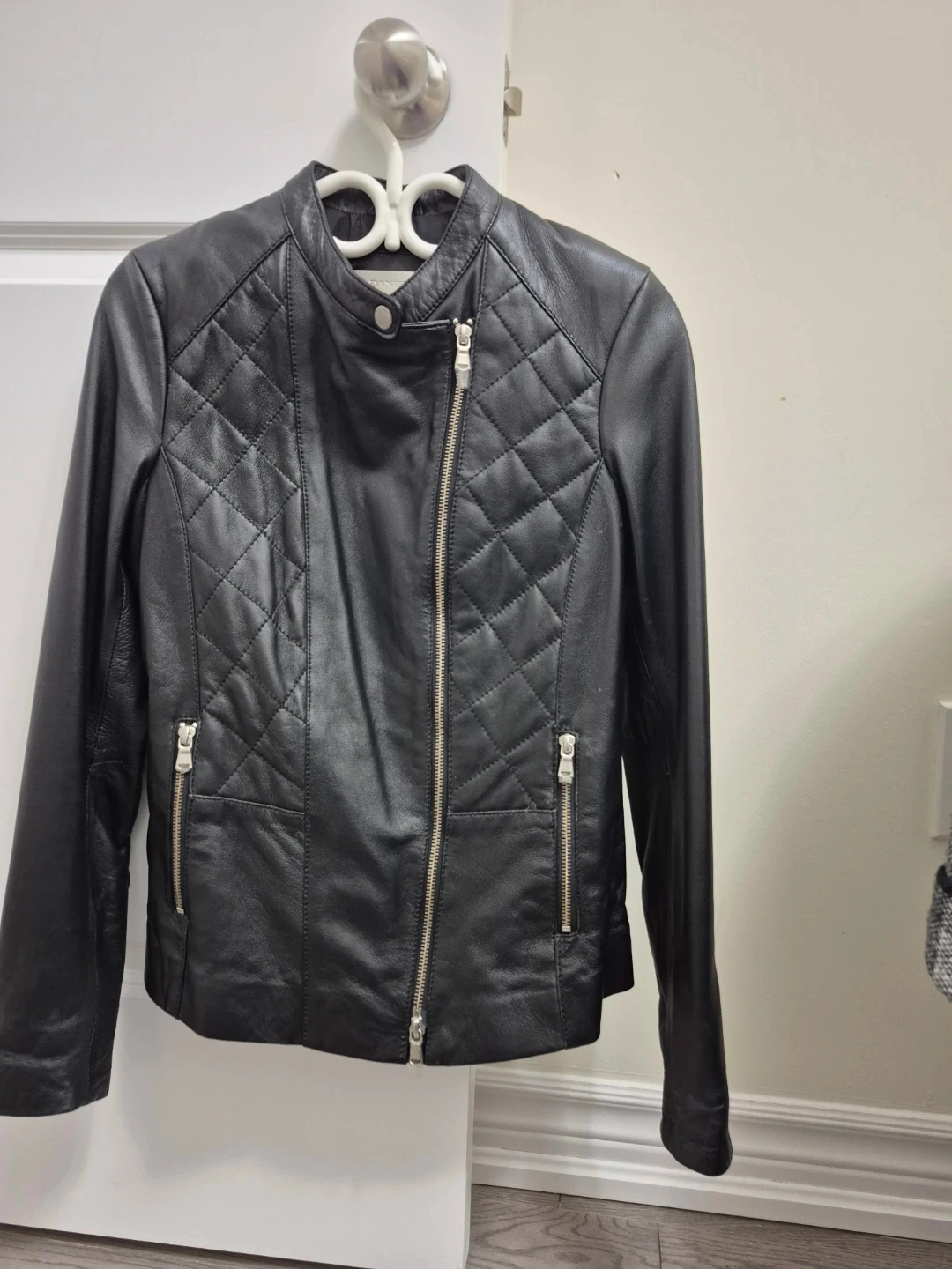 This is a stylish black leather moto jacket from DANIER. It features a quilted design on the yoke and sleeves. The jacket has a full zip front and zippered pockets.