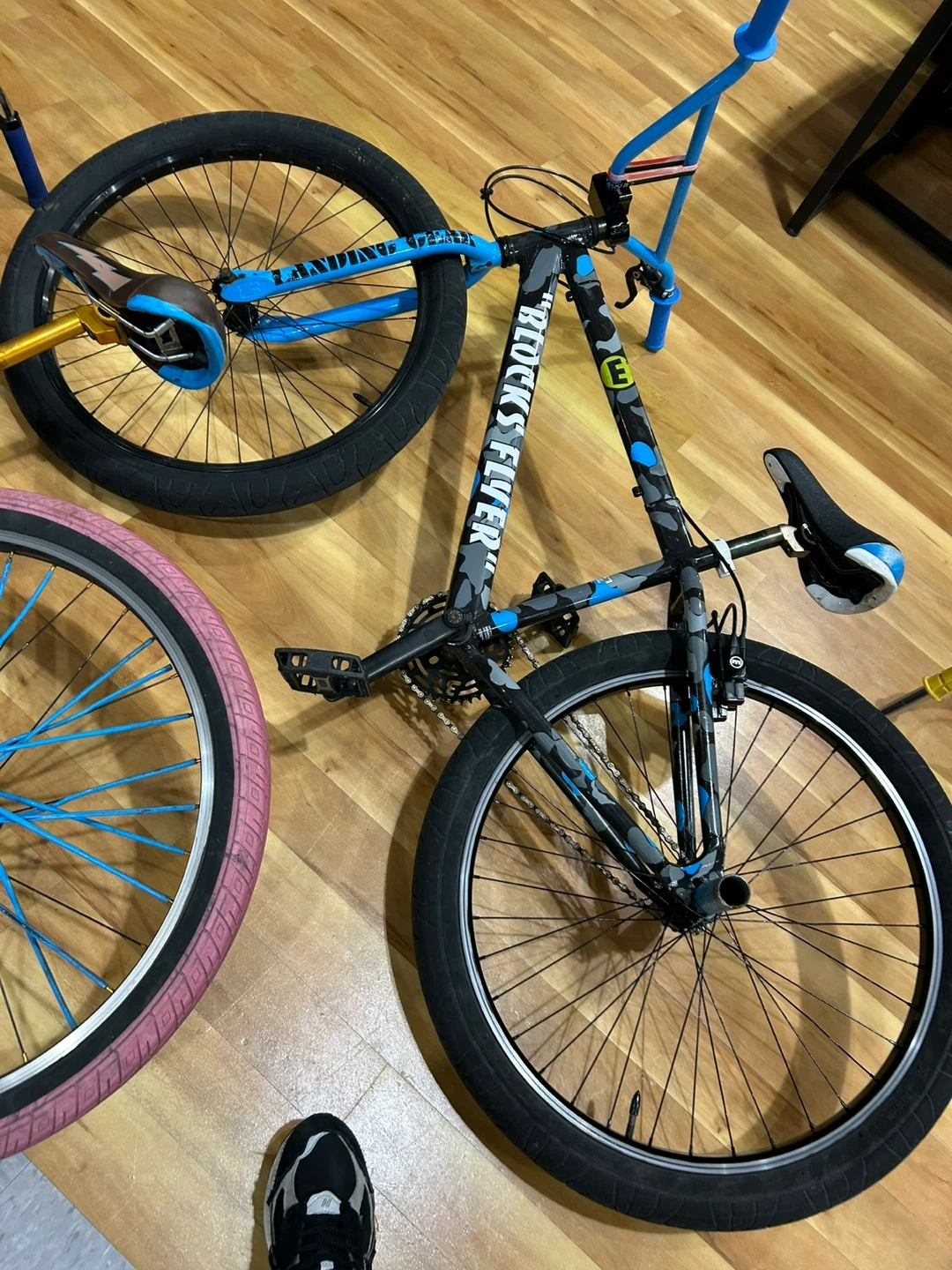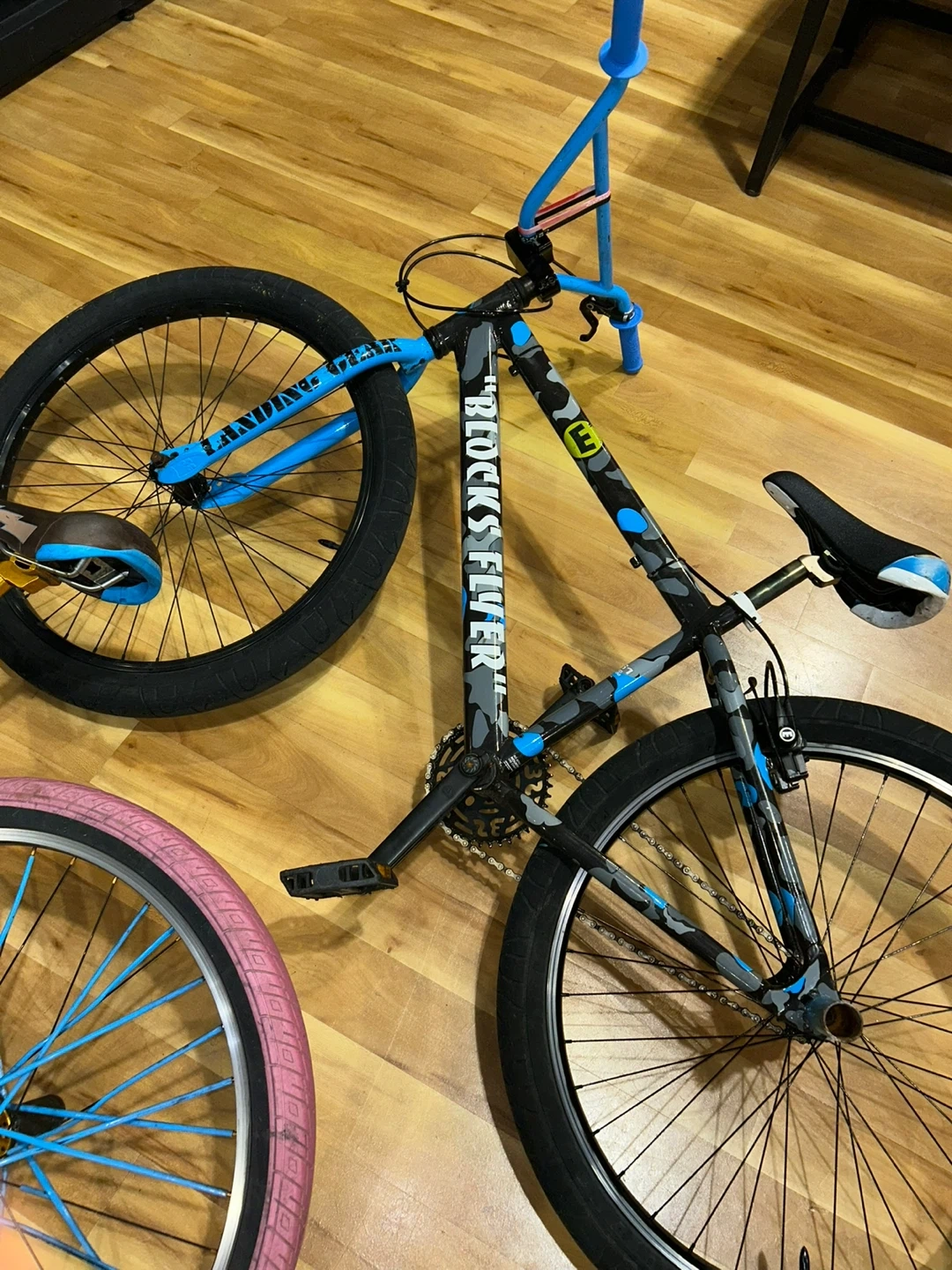 SE Bikes Blocks Flyer BMX bike. Features a gray, black, and blue camouflage design with blue handlebars and seat post. It's a BMX bike for riding.