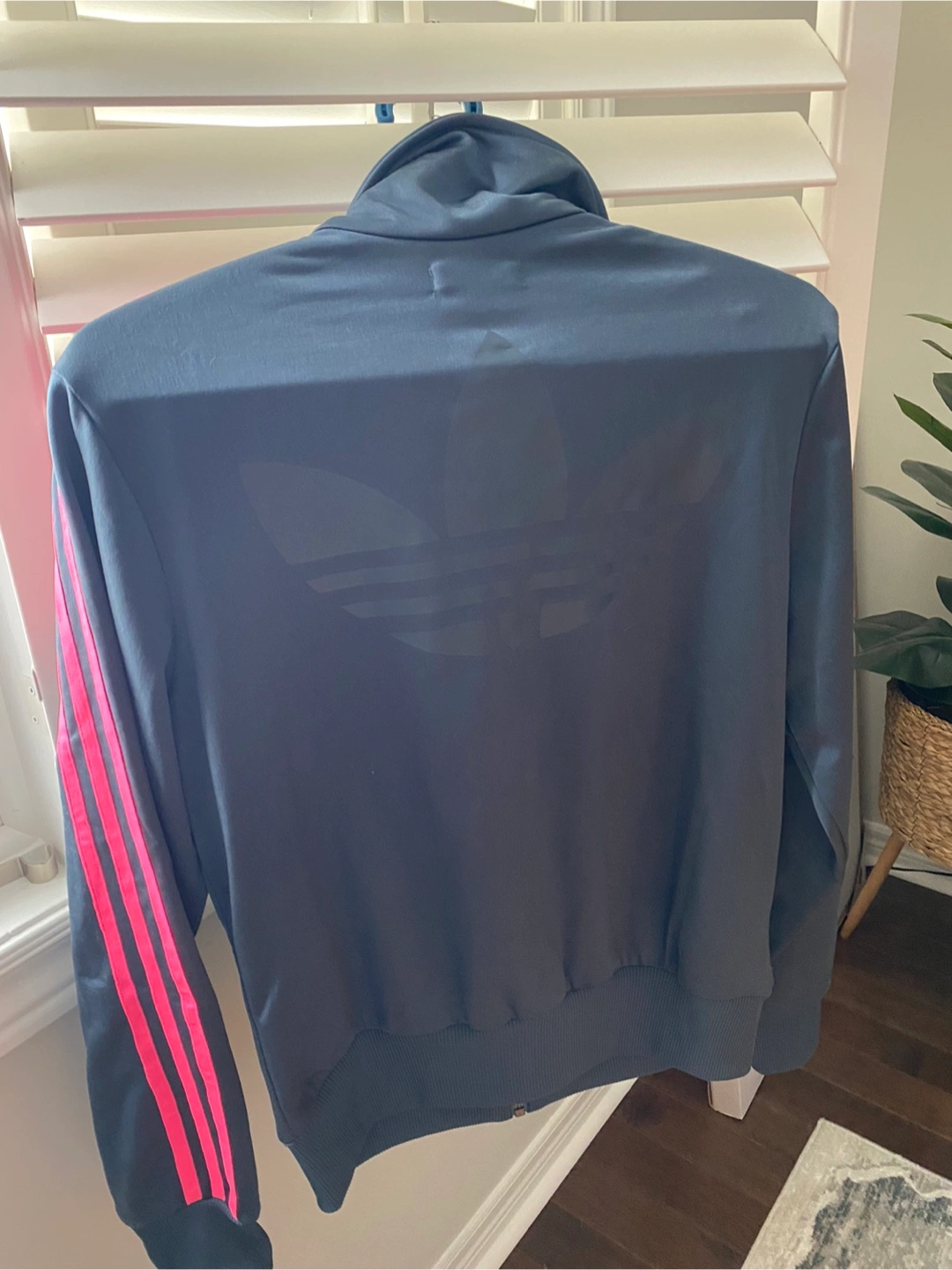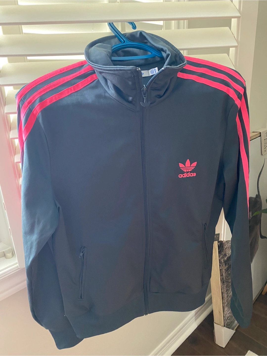 Women’s Grey Adidas track jacket with pink stripes on the sleeves. It's a size medium (M/M). Full zip front with pockets. Only worn once. Pick up in Maple