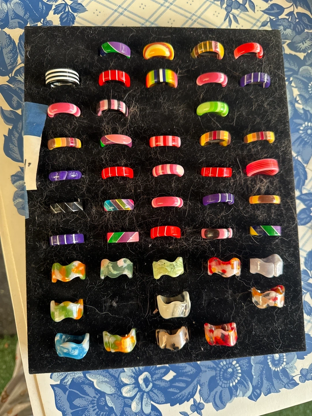 A collection of playful resin rings in various vibrant colors and patterns. These rings are perfect for adding a pop of fun to any outfit. They're lightweight and comfortable for everyday wear. A fun set for someone who loves unique accessories!