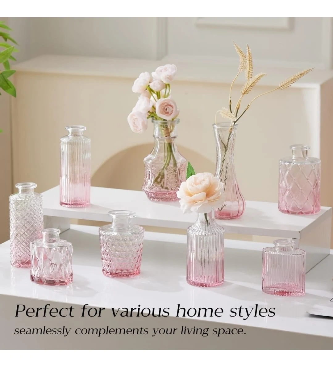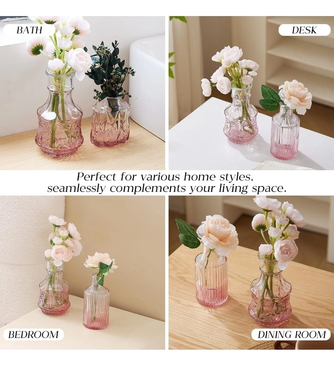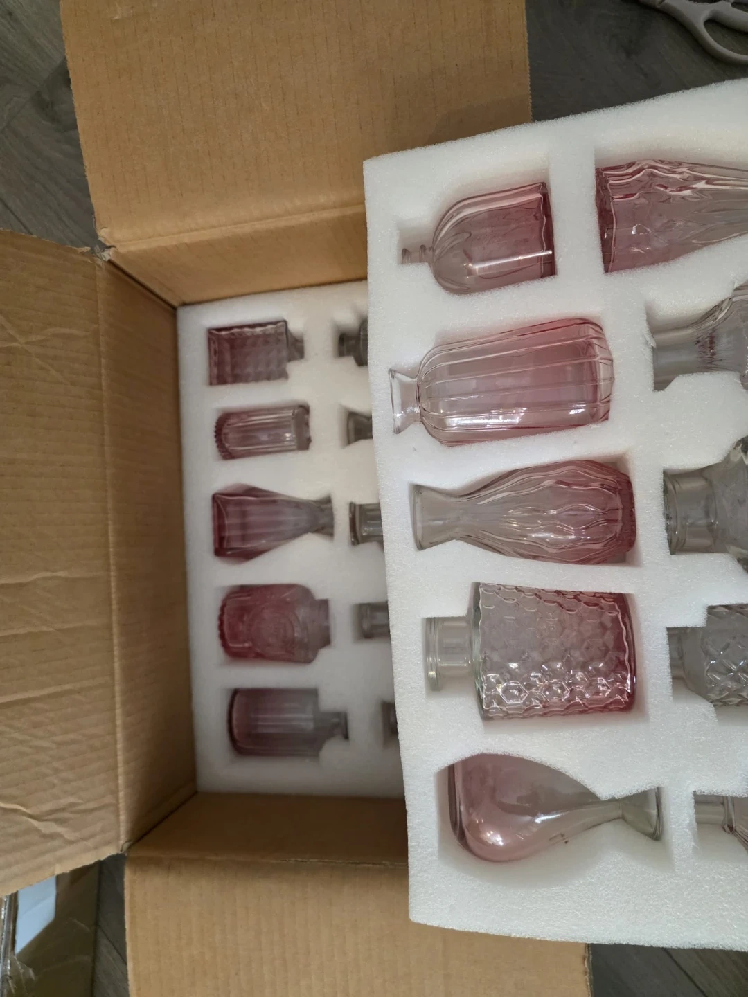 This set includes 18 small pink glass vases in various decorative styles. They're made of glass and come securely packaged in a box with foam inserts. These vases are great for small bouquets or single stems.