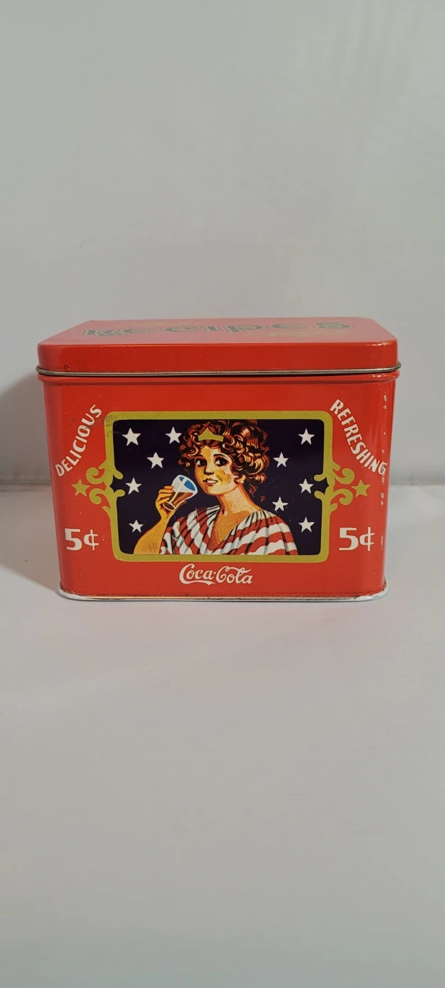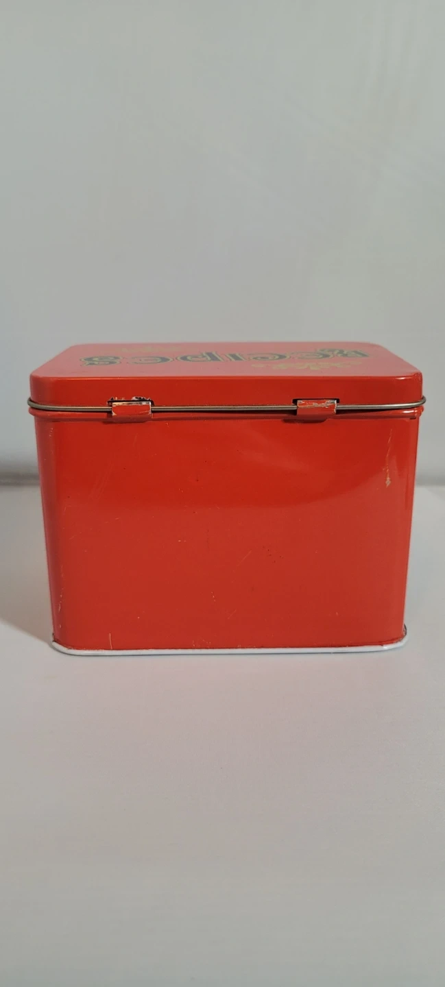 Retro red Coca-Cola tin featuring "Recipes" on the lid. It has vintage "Delicious and Refreshing" graphics with a 5 cent price. Great for storing small items or as a collectible!