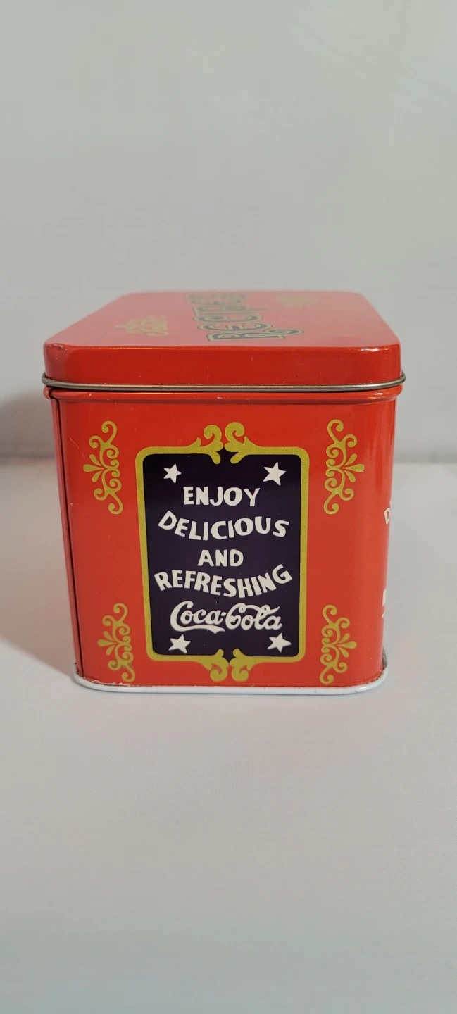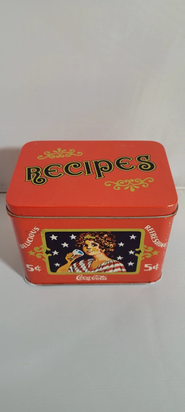 Retro red Coca-Cola tin featuring "Recipes" on the lid. It has vintage "Delicious and Refreshing" graphics with a 5 cent price. Great for storing small items or as a collectible!