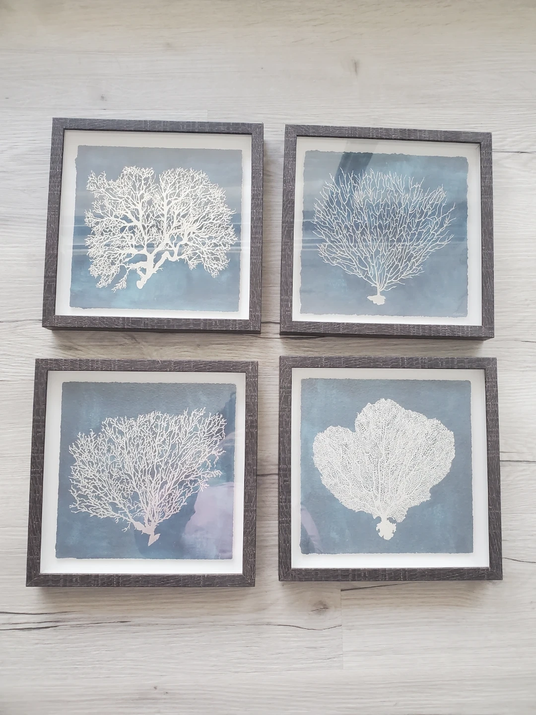 This set features four framed prints with white coral and sea fan designs on a blue, textured background. Each piece has a dark grey wood-look frame and white matting. They're perfect for adding a coastal touch to any room!