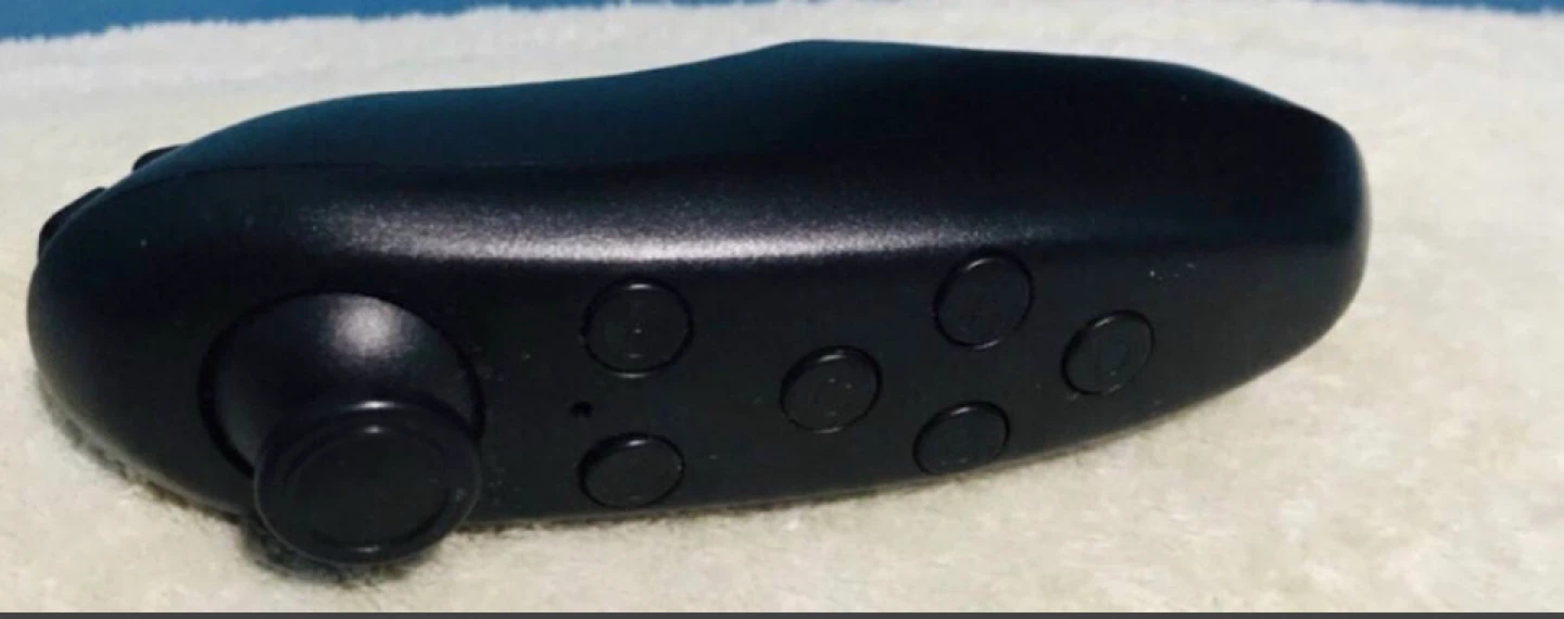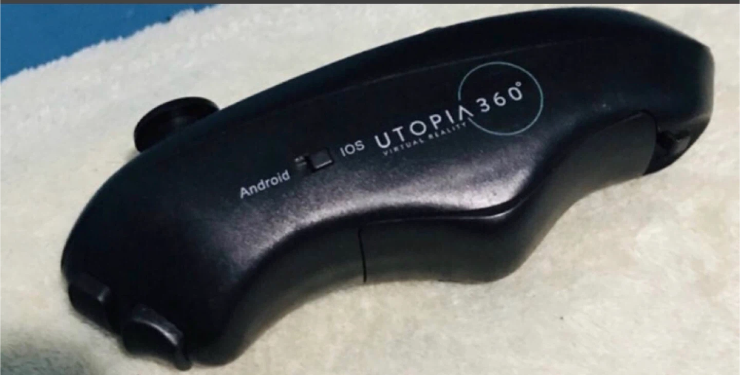 This is a Utopia 360 virtual reality headset. It's a black headset that comes with a black VR controller. The controller is compatible with Android and iOS devices.