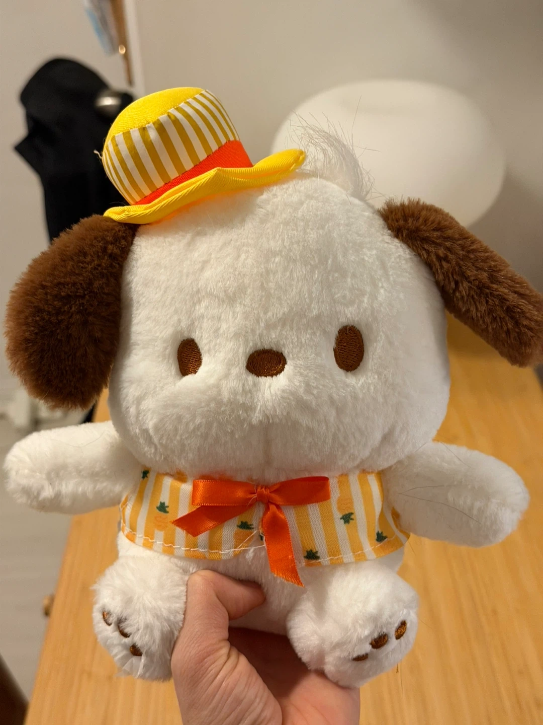 This is a cute plush toy of Pochaco, the Sanrio character. It's wearing a striped hat and a matching shirt with an orange ribbon. It's soft and cuddly, perfect for fans of the character!