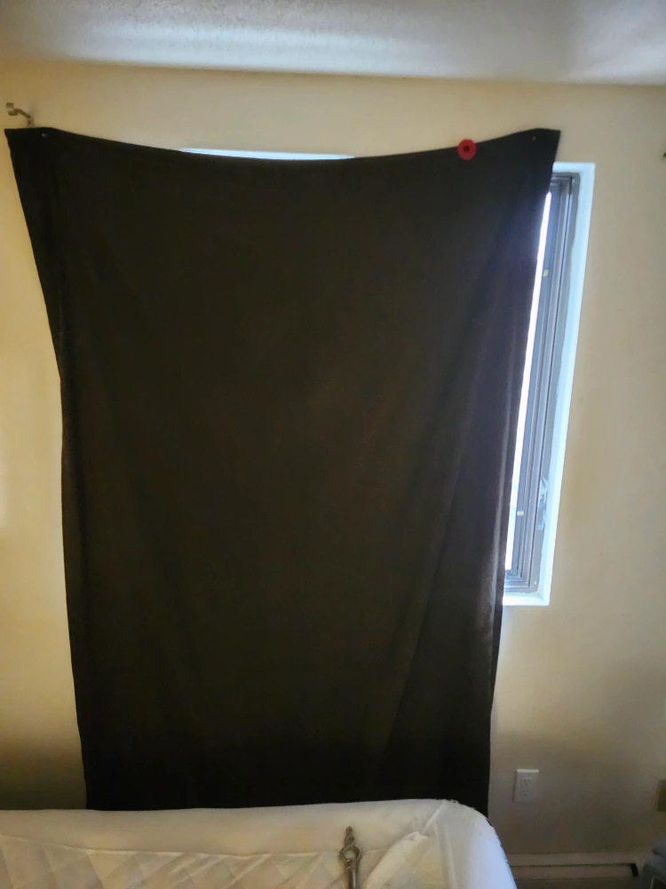 This is a dark brown curtain, likely made of cotton. It's been hung over a window and appears to be a decent size. Also included is a decorative metal curtain rod, complete with finials on both ends. It's great for blocking out light!