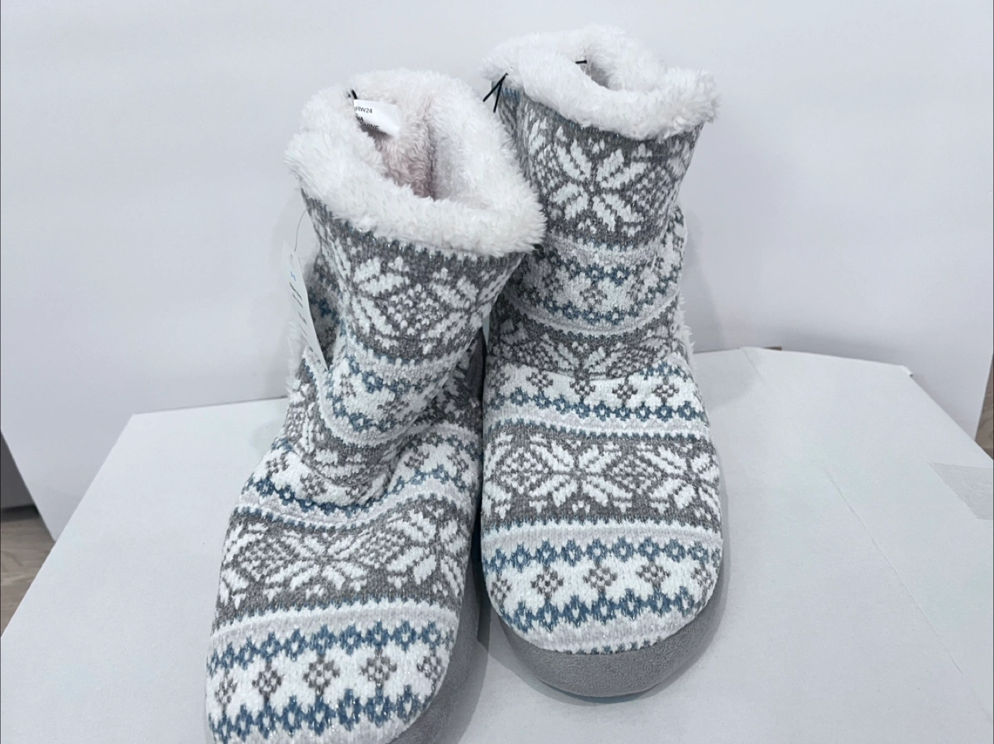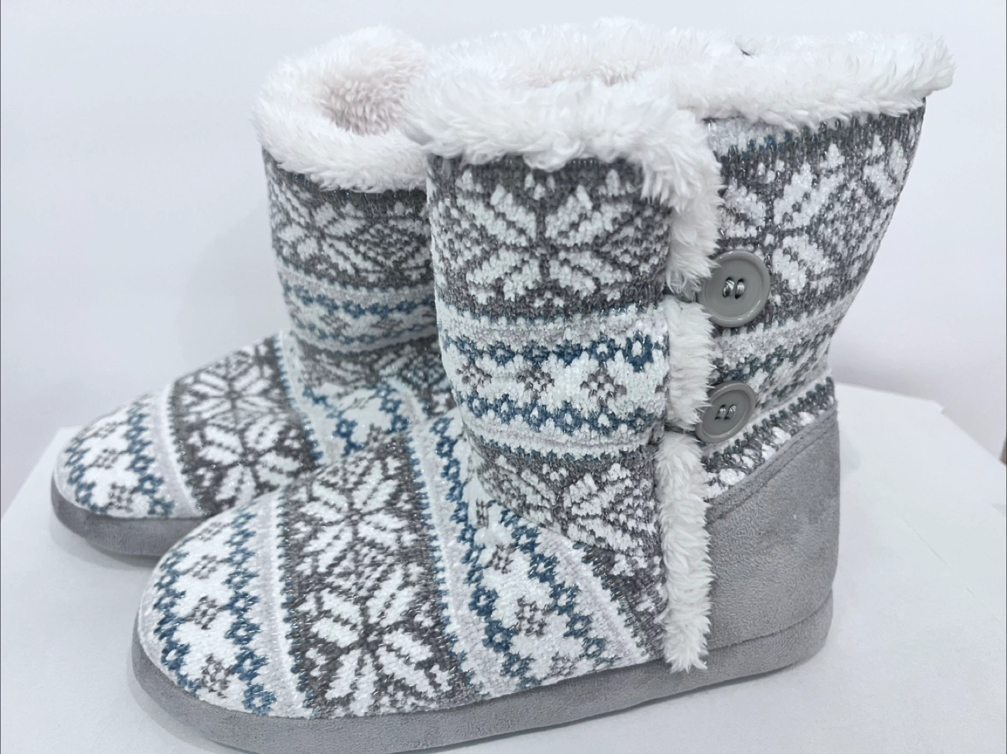 BRAND NEW Warm and cozy slipper booties. Fair isle knit pattern. Grey, white, and blue colour scheme. Soft fleece lining. Size L(9-10). Size 6/7 and 7/8 available Two button closure.