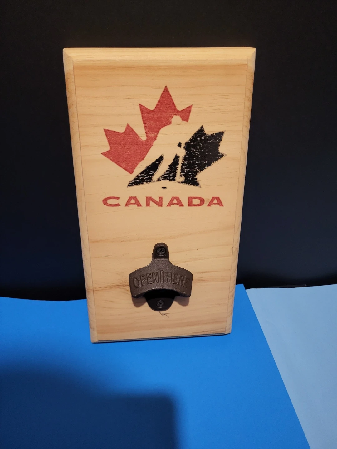 This wall-mounted bottle opener features a classic Canadian maple leaf and hockey player design. It's made of wood with a metal opener.