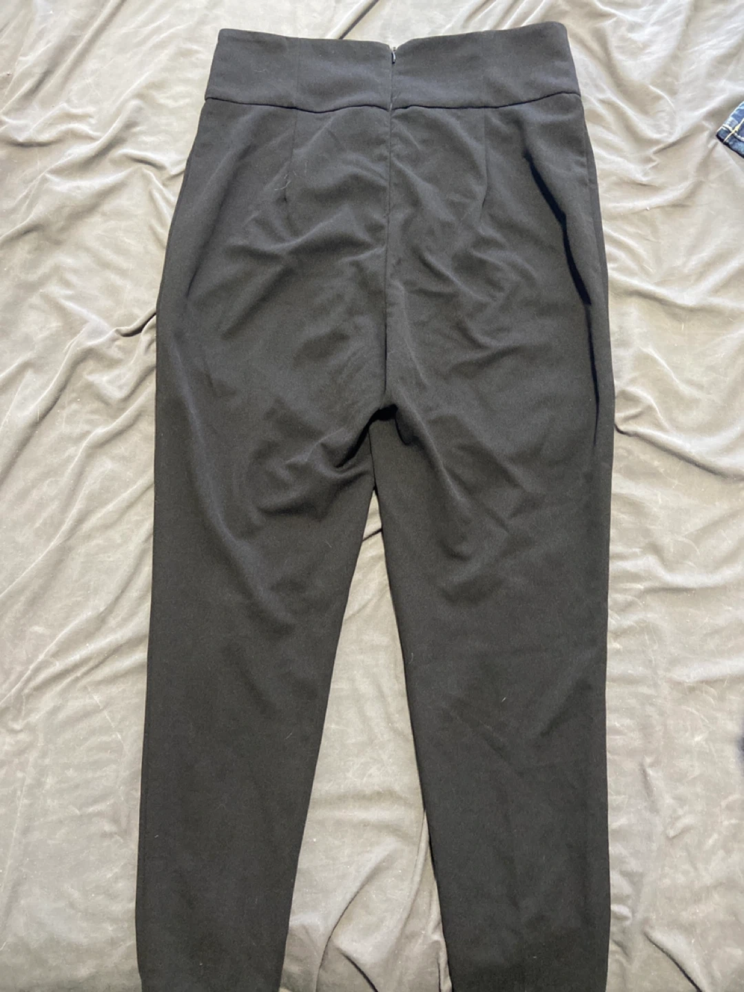 These black trousers are high-waisted and feature a zipper closure at the back. They're made from a comfortable fabric with front pleats for a stylish look. They can be dressed up or down for various occasions.
