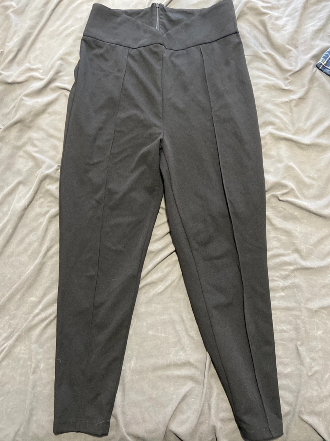 These black trousers are high-waisted and feature a zipper closure at the back. They're made from a comfortable fabric with front pleats for a stylish look. They can be dressed up or down for various occasions.