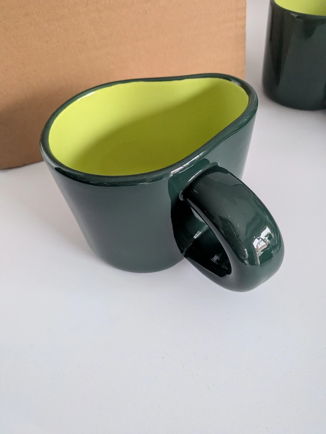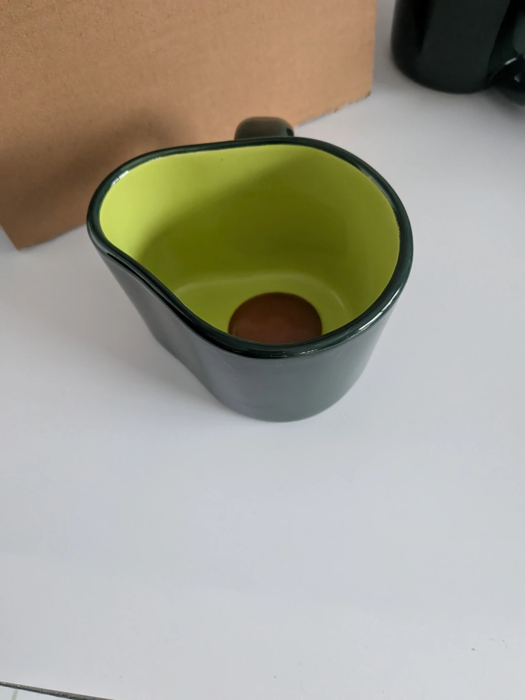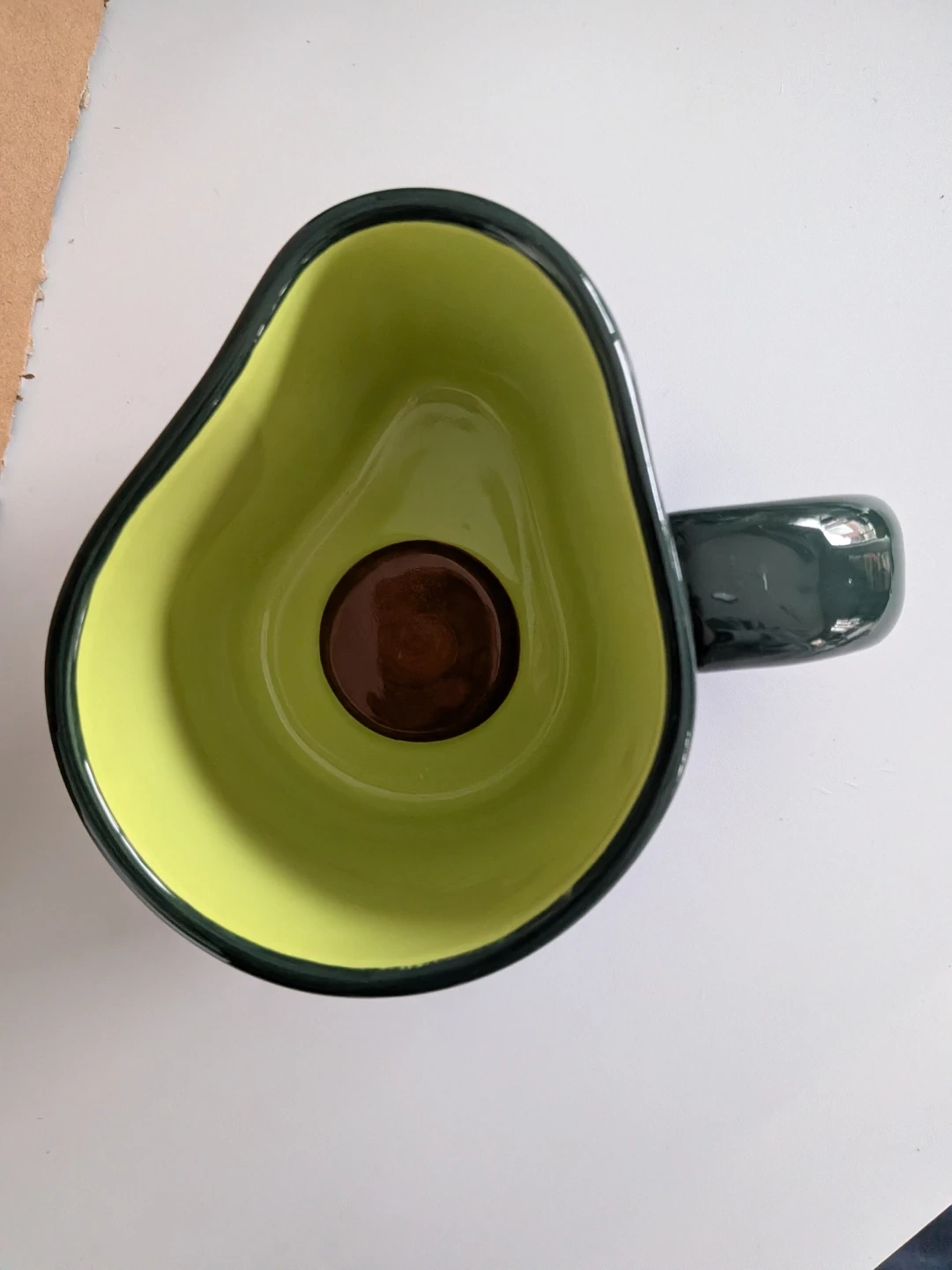 New Tabitha Brown 15.7 Fl Oz coffee mug, a stylish and functional addition to any kitchen. This mug features a unique avocado shape with a striking green exterior and a contrasting light green interior, adding a pop of colour to your morning coffee or tea. This stoneware mug is both dishwasher and microwave safe.