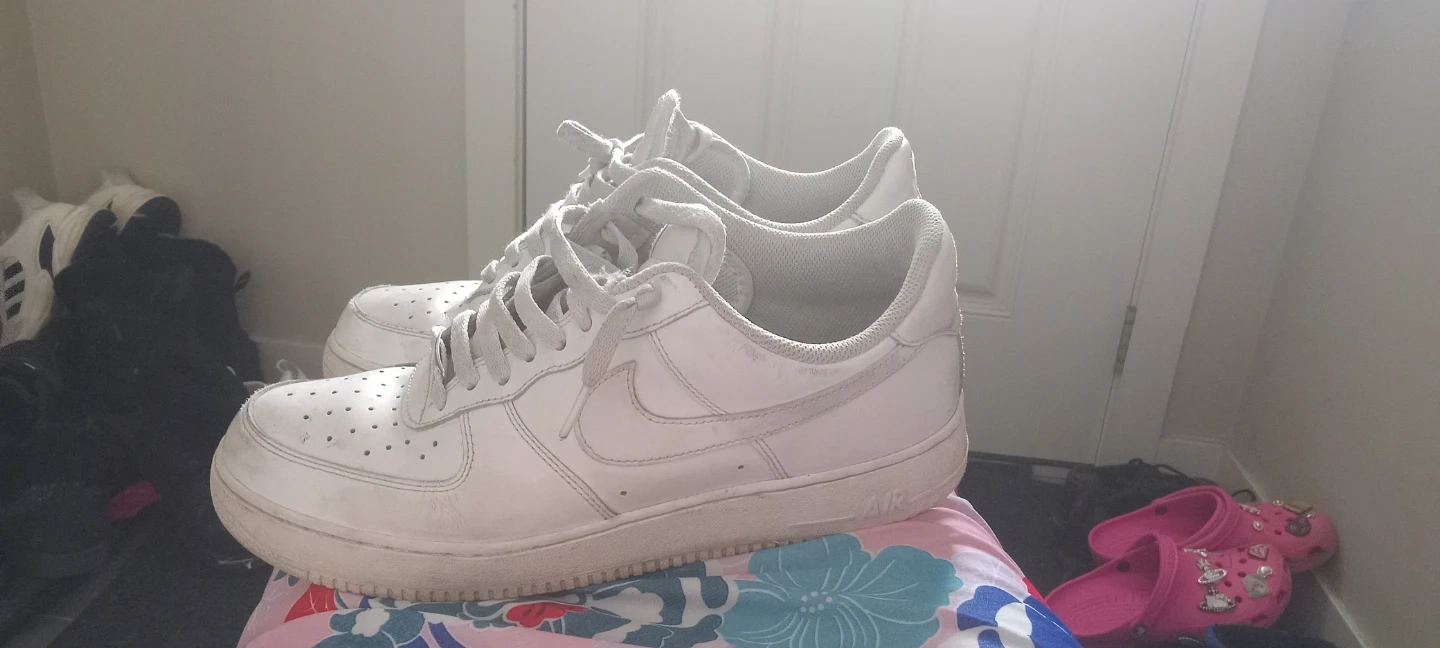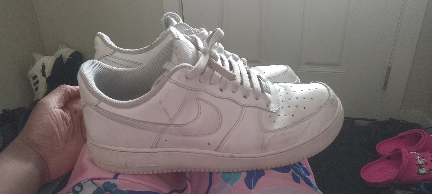 White Nike Air Force 1 sneakers. Leather upper with lace-up closure. These kicks are a classic for a reason!
