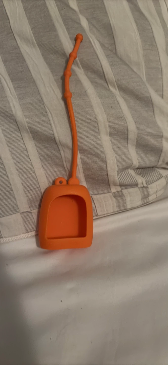 This is an orange silicone holder for a small hand sanitizer bottle. It has a loop on top with a lanyard attached, perfect for clipping to a bag or belt loop. It's made of flexible silicone material. Keep sanitizer handy for on-the-go use!