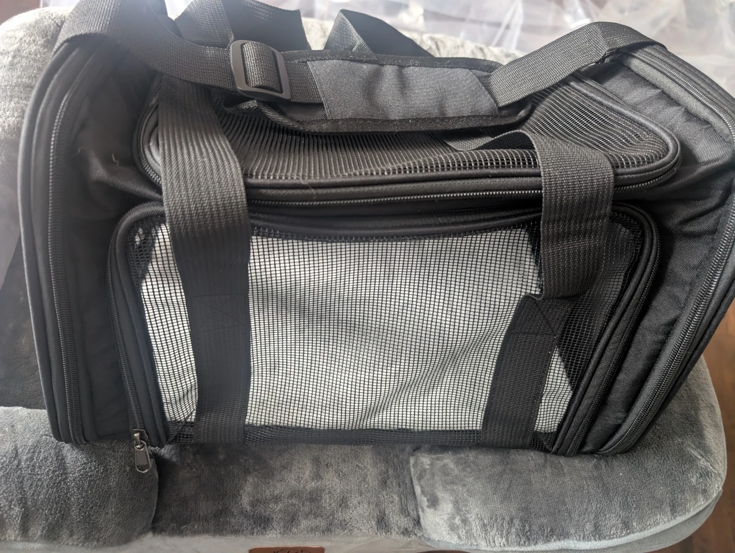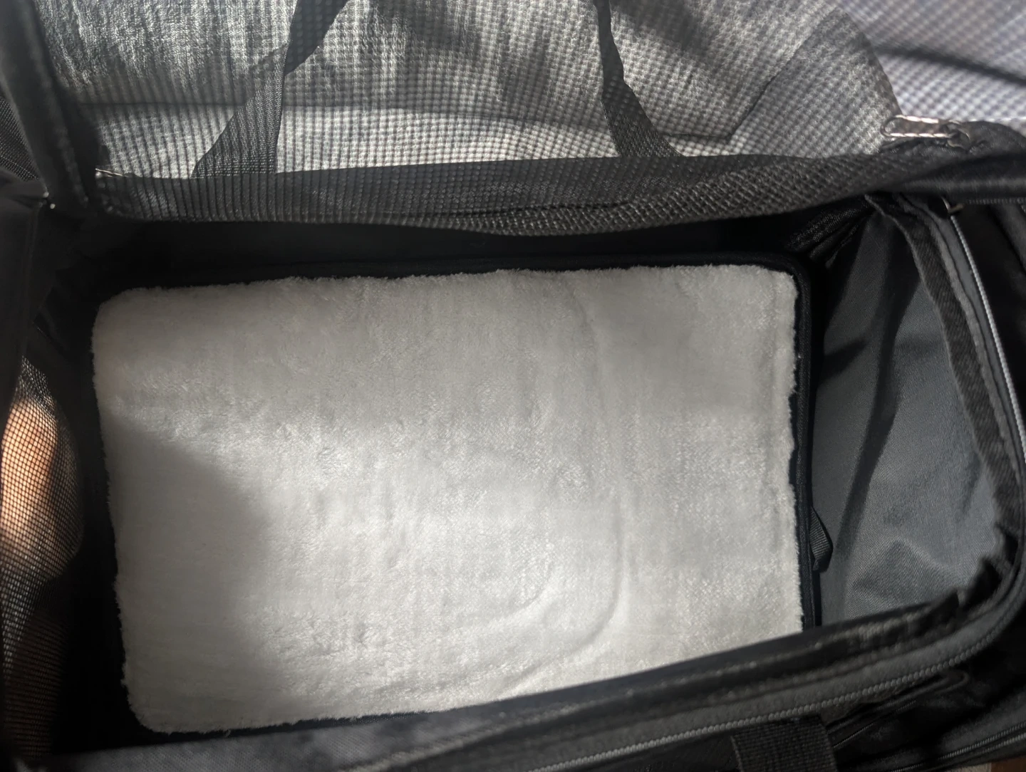 This is a black pet carrier bag with a soft, plush interior mat. It features mesh windows for ventilation and easy carrying straps. Ideal for small pets on the go!