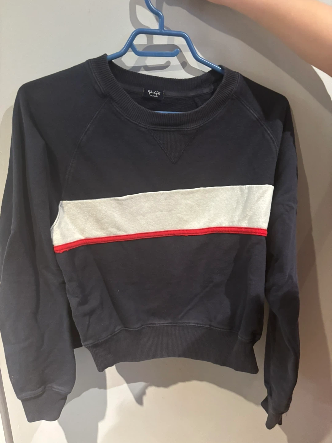 Navy blue Brandy Melville cropped sweatshirt. Features a white and red stripe detail across the chest. Made from soft cotton for comfort.
