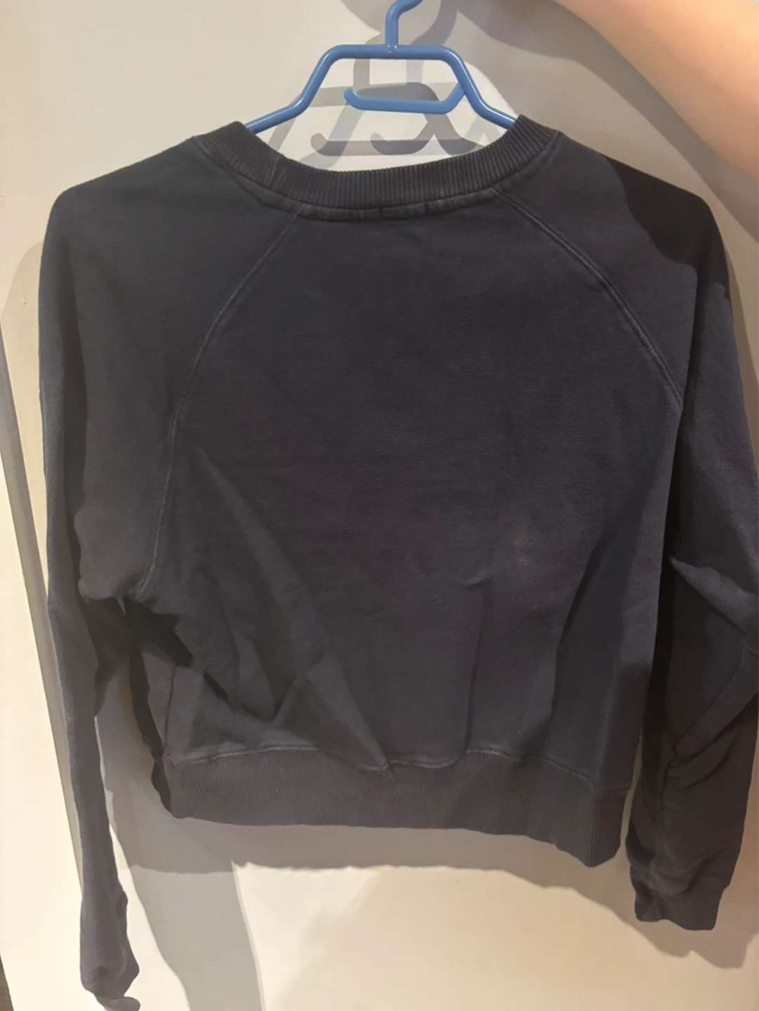 Navy blue Brandy Melville cropped sweatshirt. Features a white and red stripe detail across the chest. Made from soft cotton for comfort.
