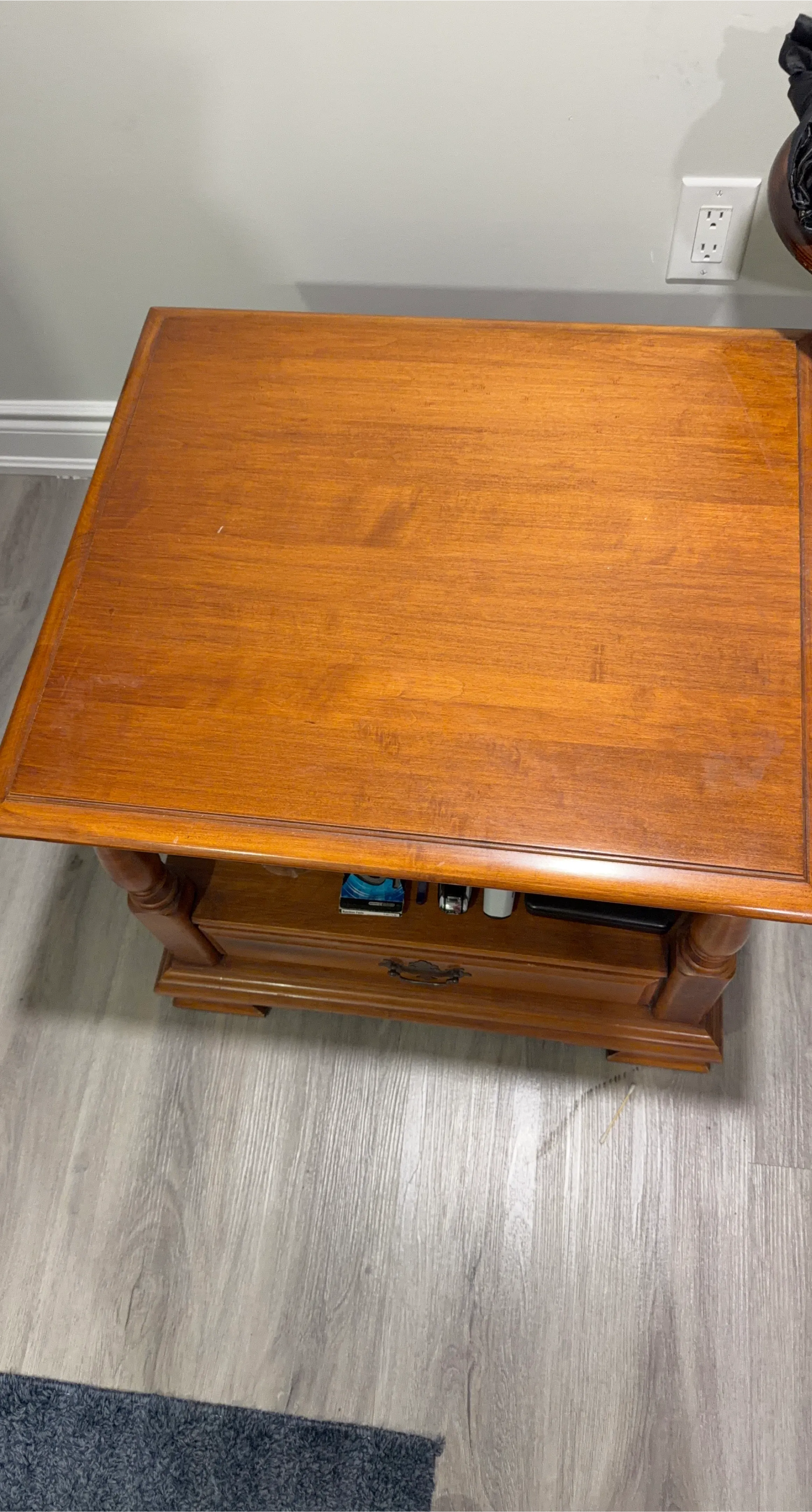 Selling a used wooden coffee table. It features a warm, brown finish and a classic design with a lower shelf for storage. It's perfect for any living room!