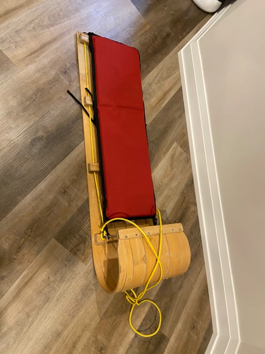 Classic wooden toboggan for winter fun! It features a comfortable red padded seat for a smooth ride. Includes a yellow pull rope. Perfect for gliding down snowy hills!