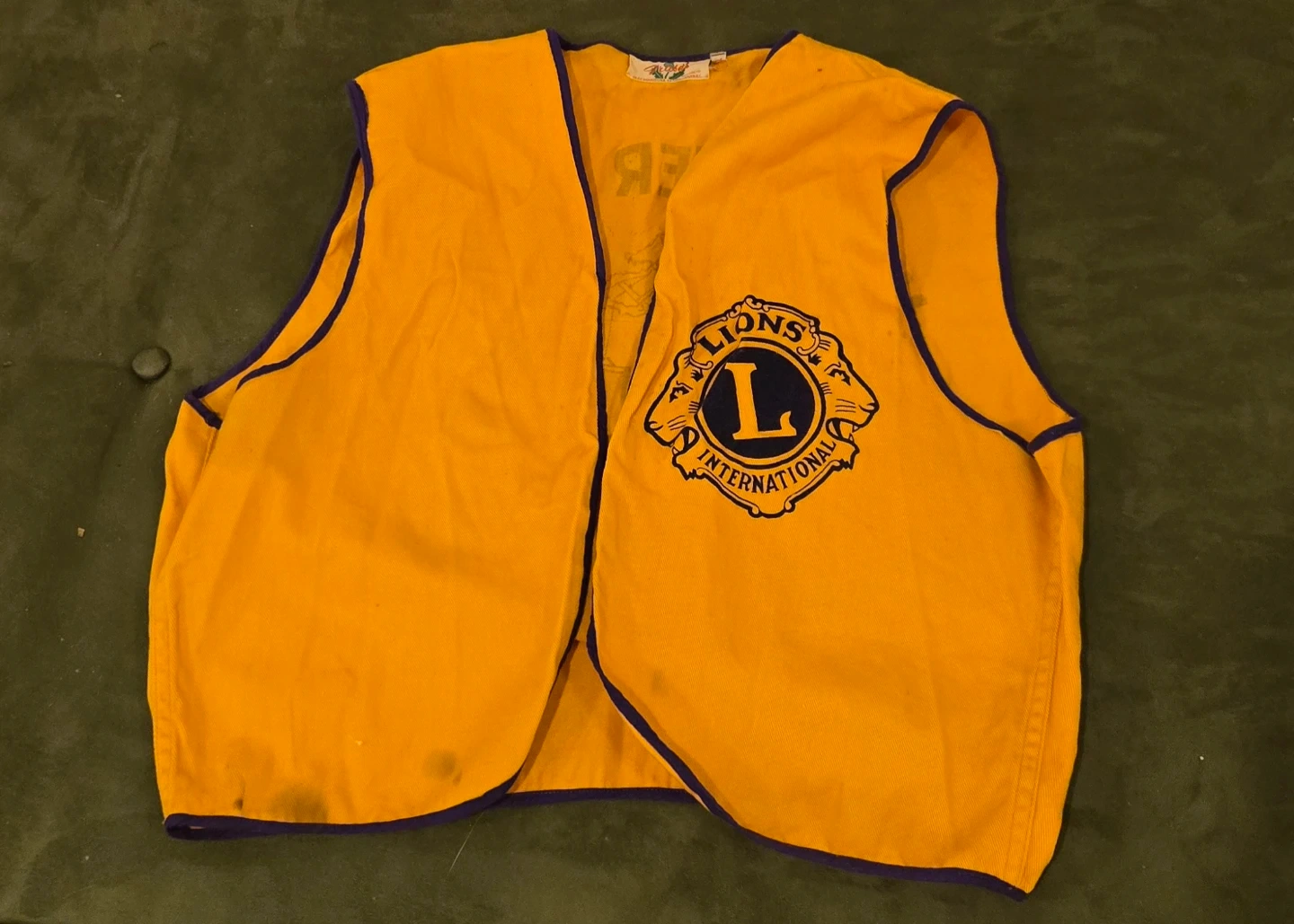 This is a yellow vest with blue trim from Fraser. It features 'Vancouver South Lions' printed on the back and the Lions International logo on the front. A tag inside indicates NFC.CO.LTD. from 1932 Manitoba St. Vancouver B.C. Has a few stains.