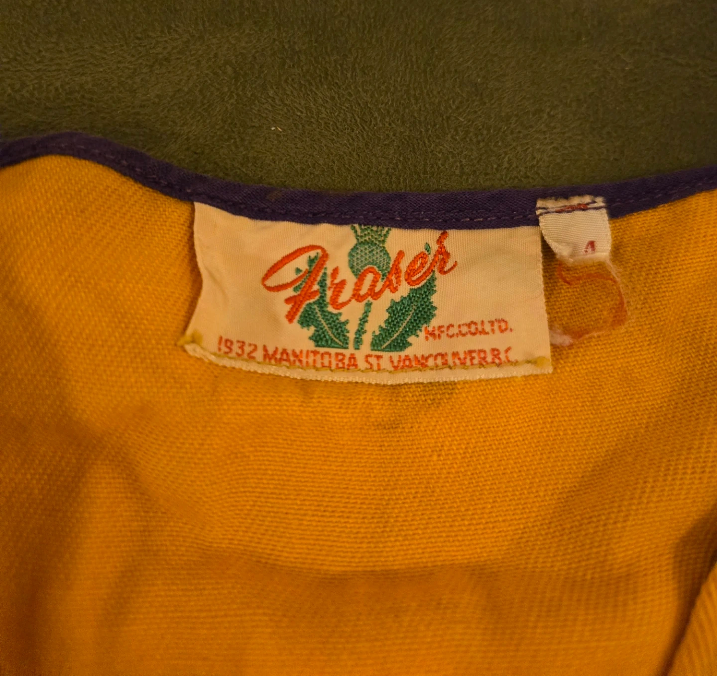 This is a yellow vest with blue trim from Fraser. It features 'Vancouver South Lions' printed on the back and the Lions International logo on the front. A tag inside indicates NFC.CO.LTD. from 1932 Manitoba St. Vancouver B.C. Has a few stains.