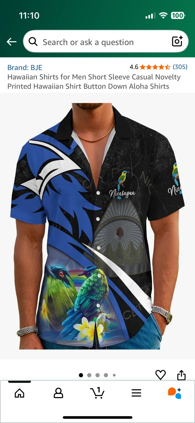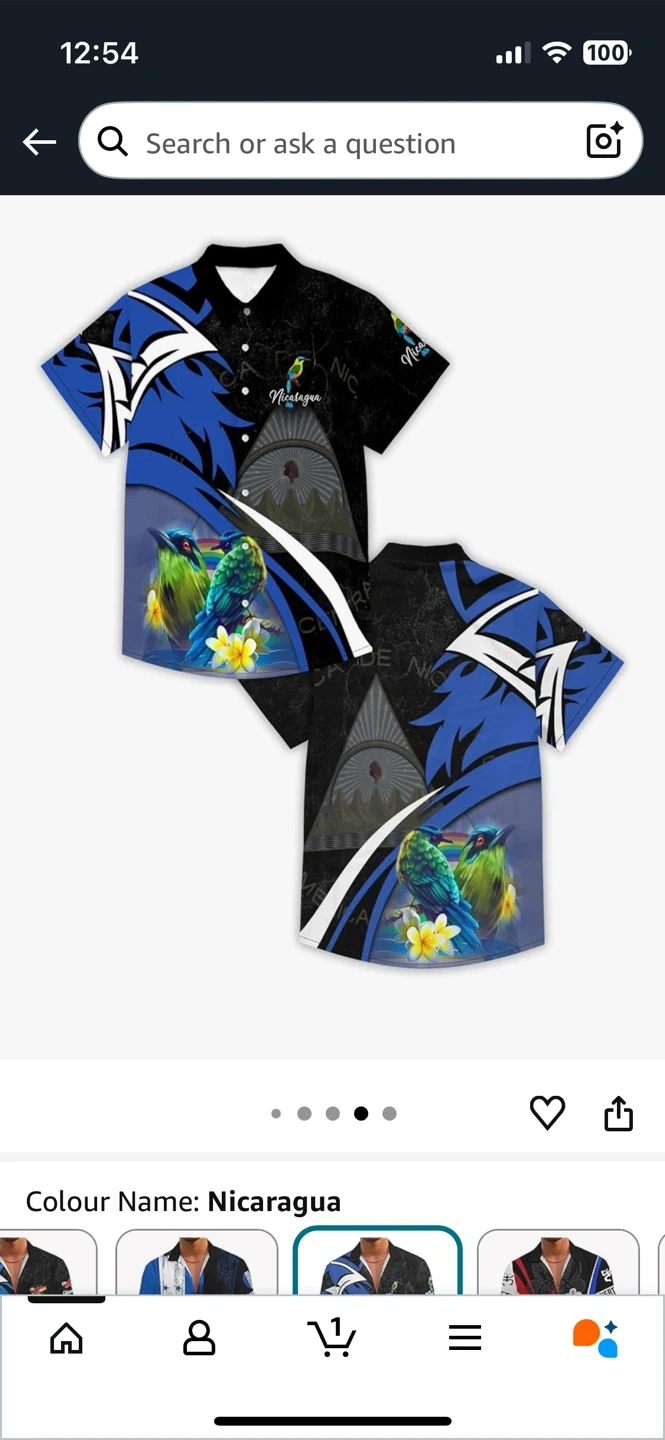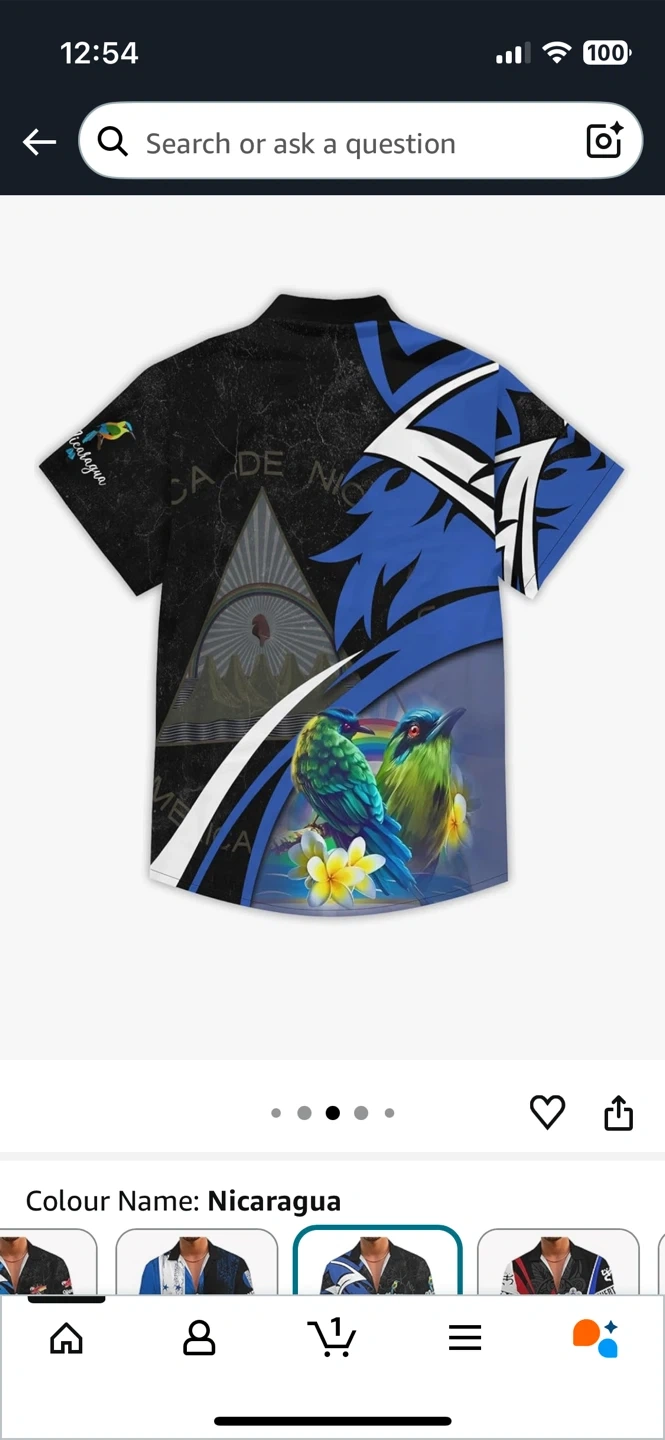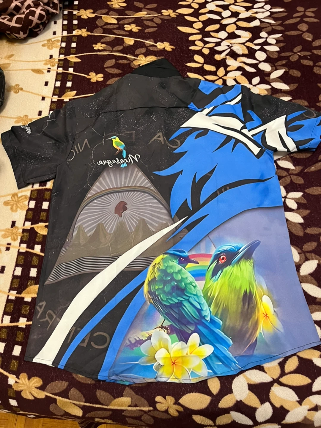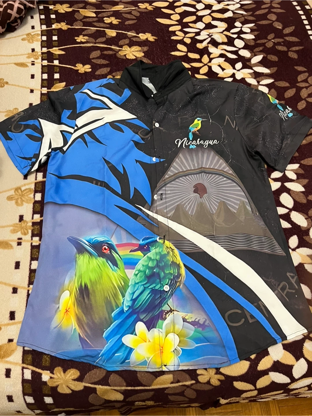 Cool short-sleeve button-down shirt with a vibrant Nicaragua design featuring birds and flowers. Casual novelty printed aloha shirt.