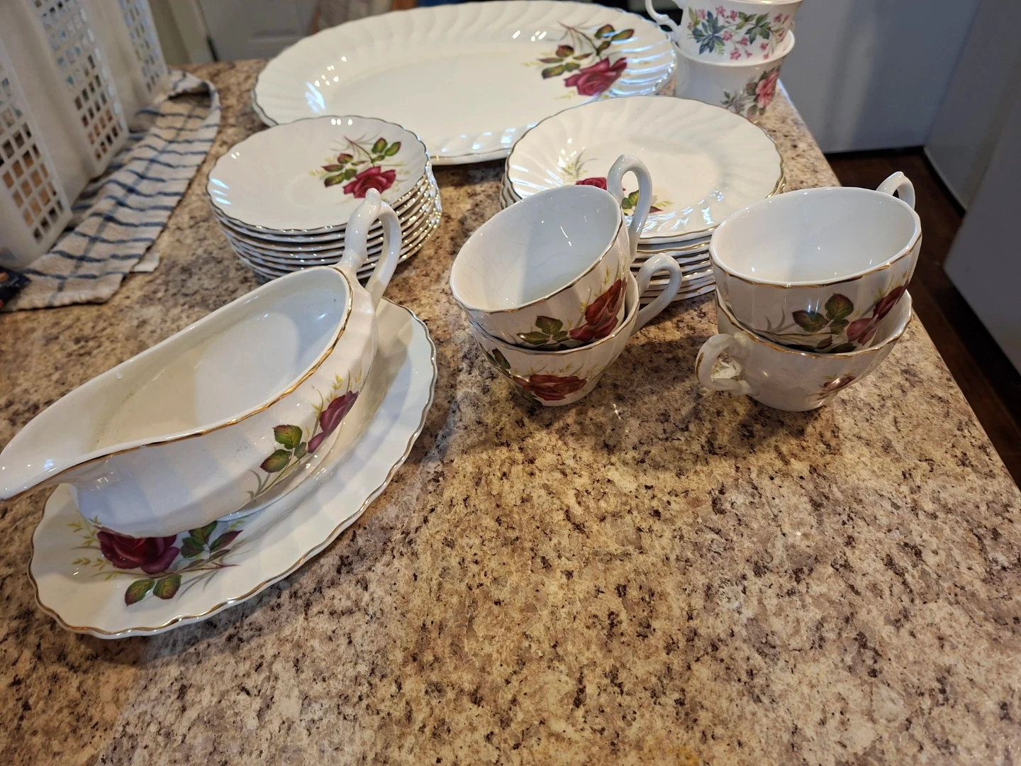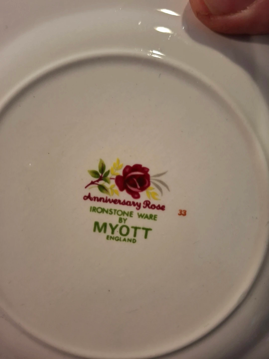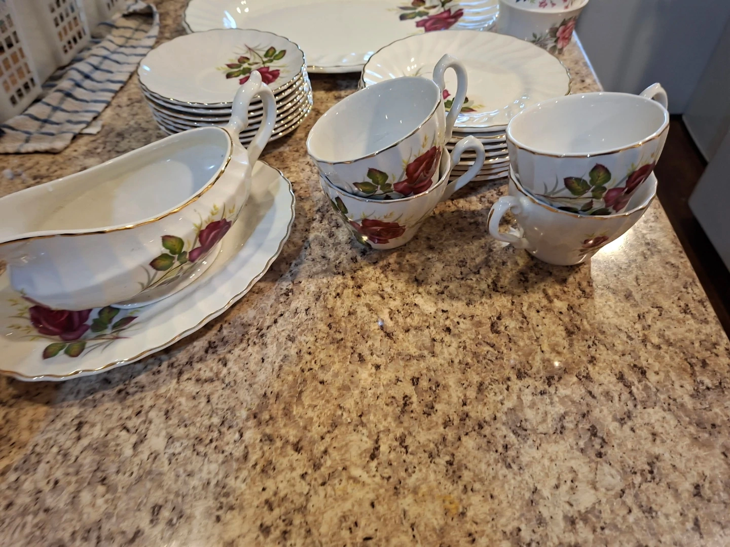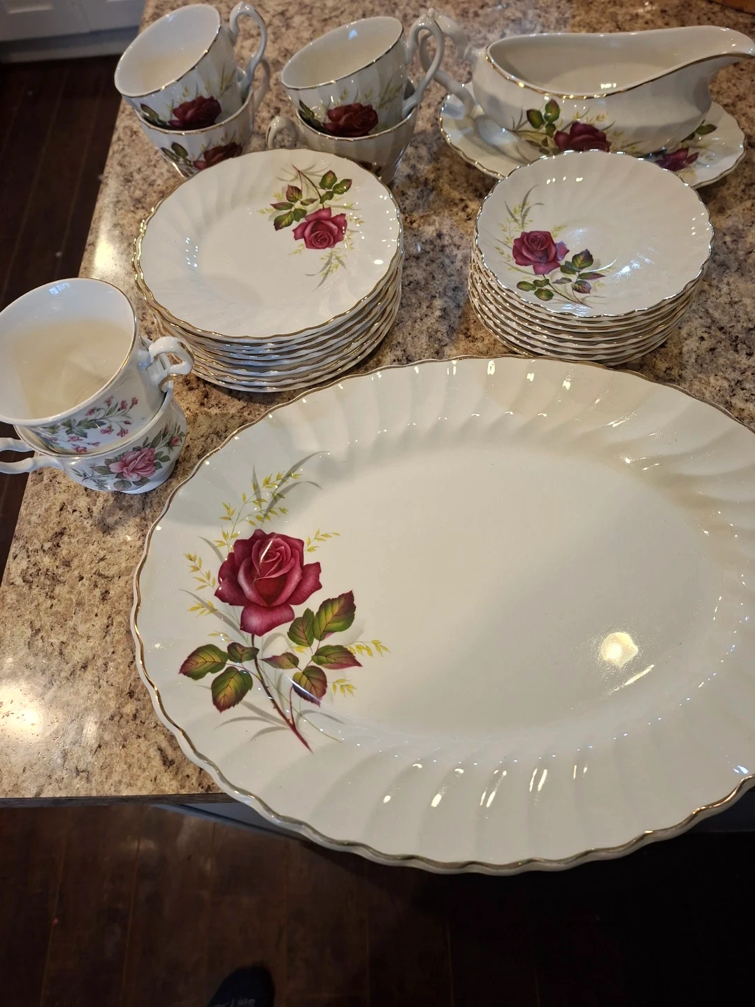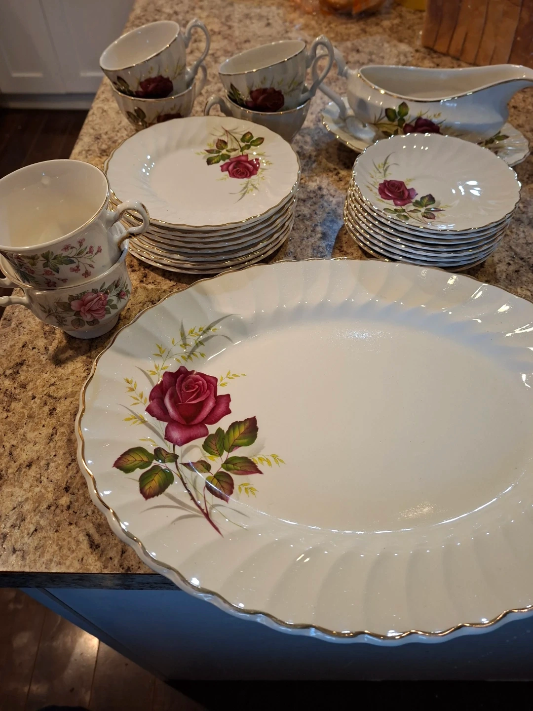 This Myott "Anniversary Rose" Ironstone Ware set features a beautiful rose pattern with gold trim. It includes cups, saucers, plates, and a large serving platter. This vintage china would be lovely for special occasions or everyday elegance!