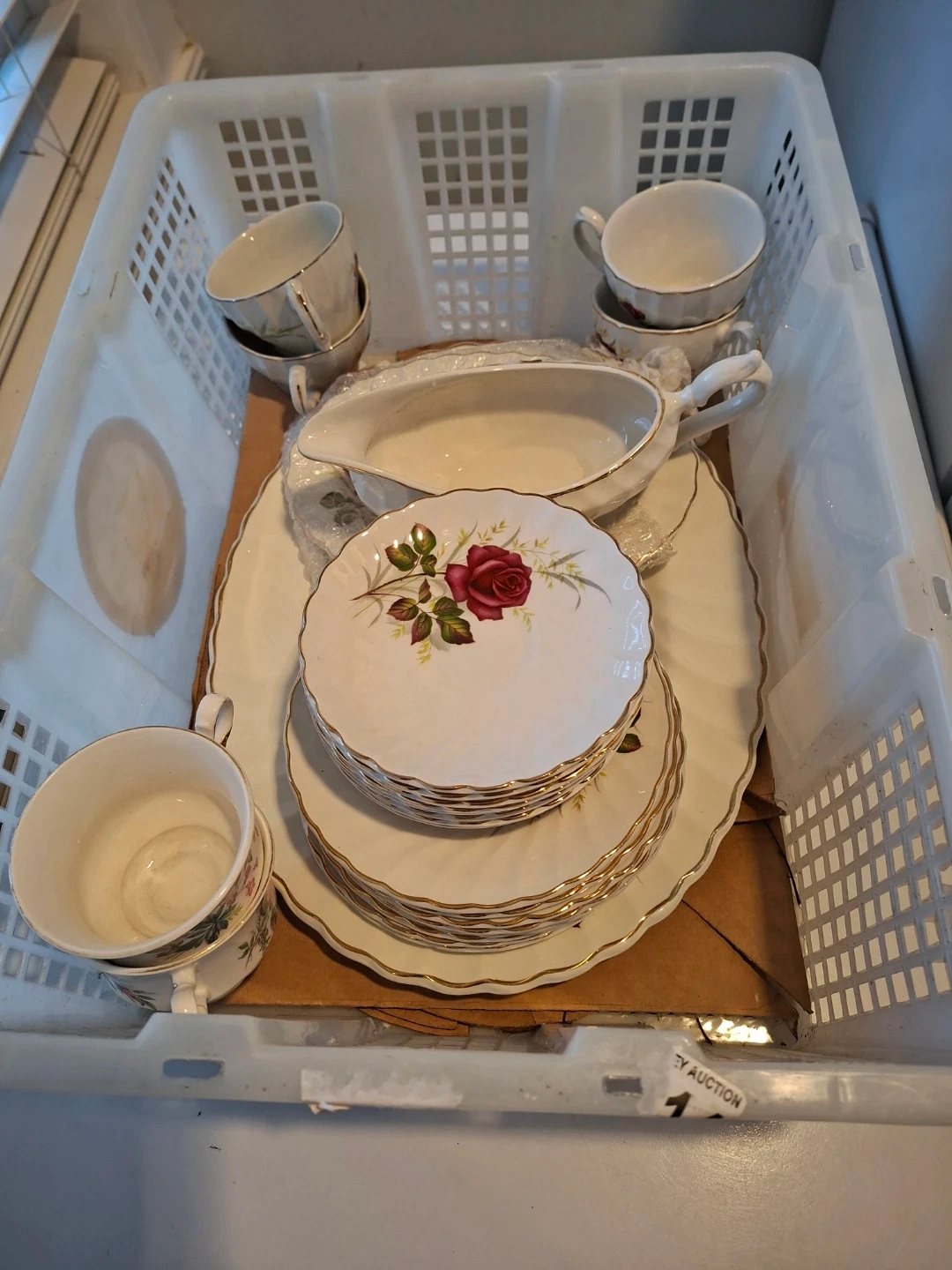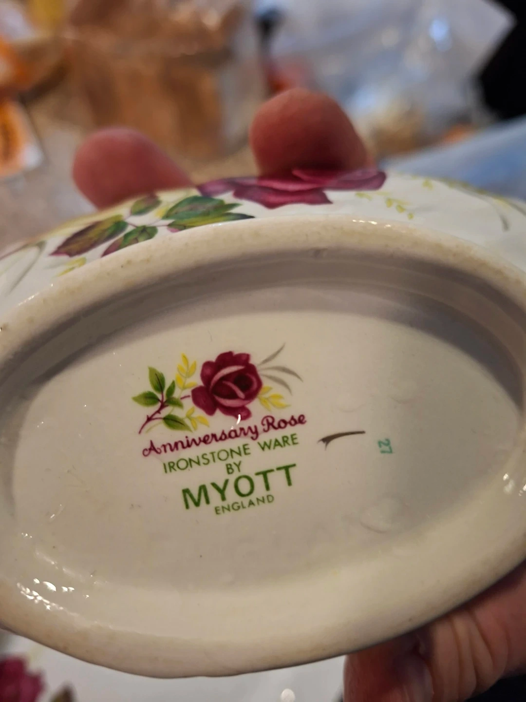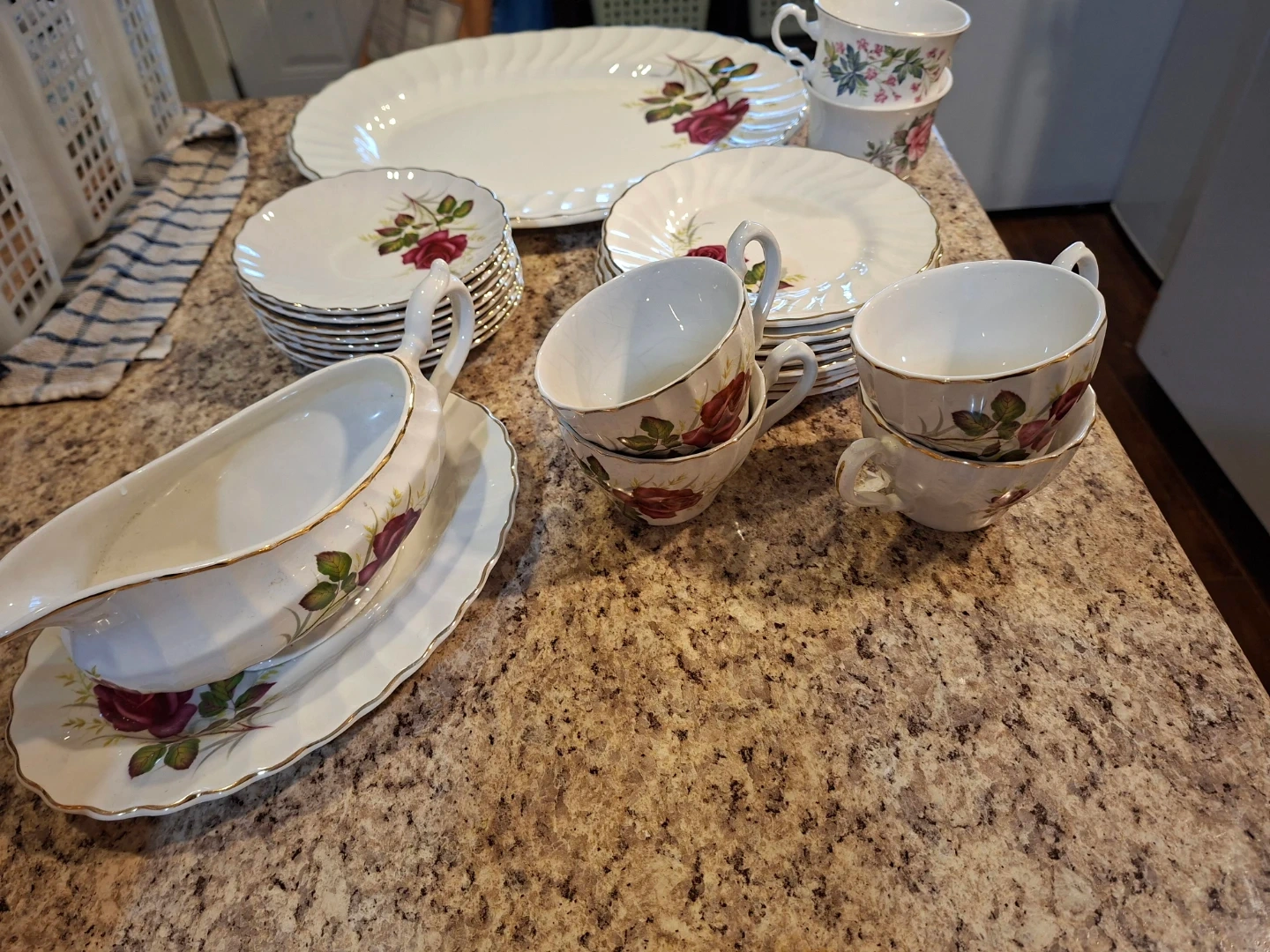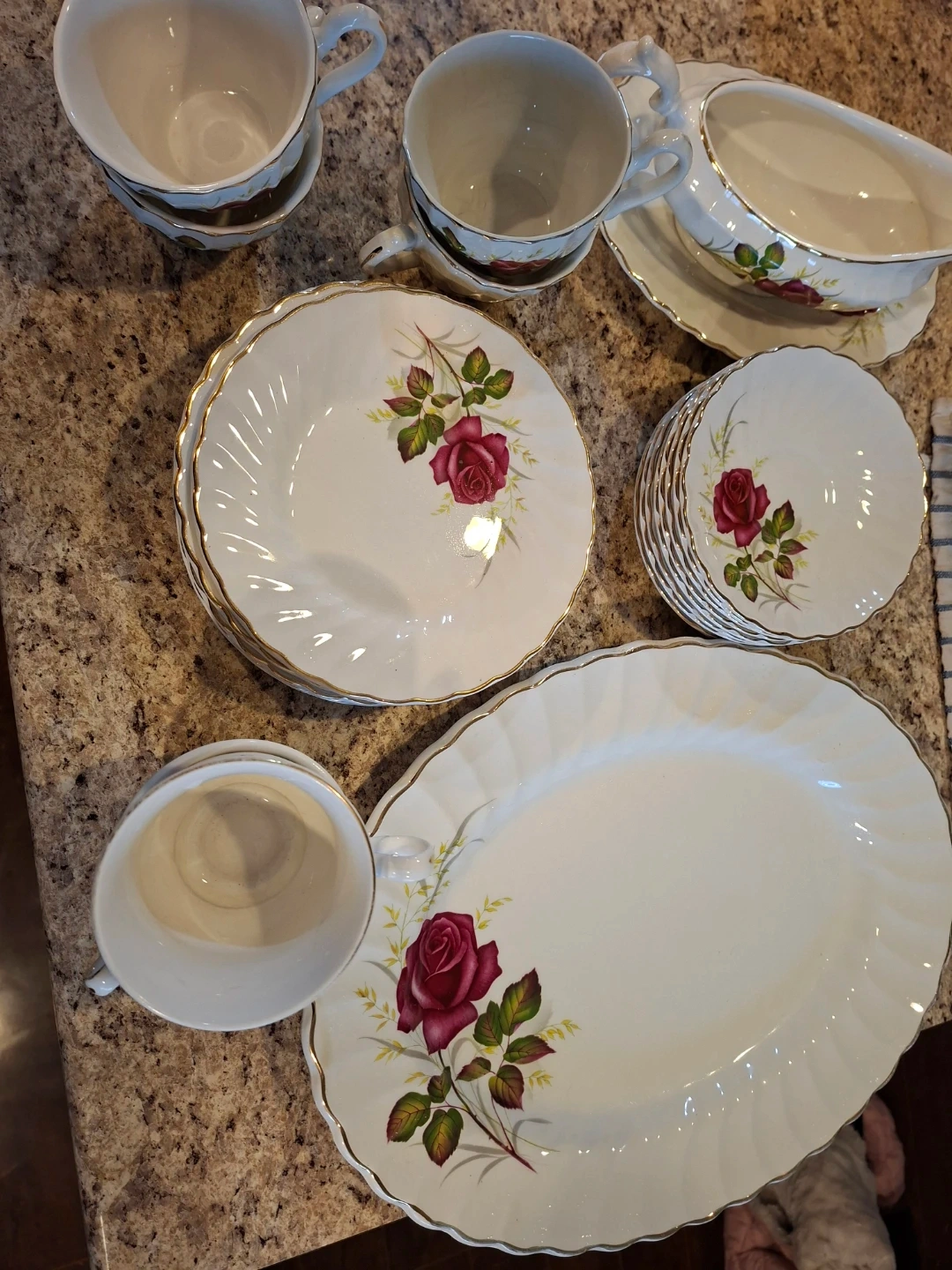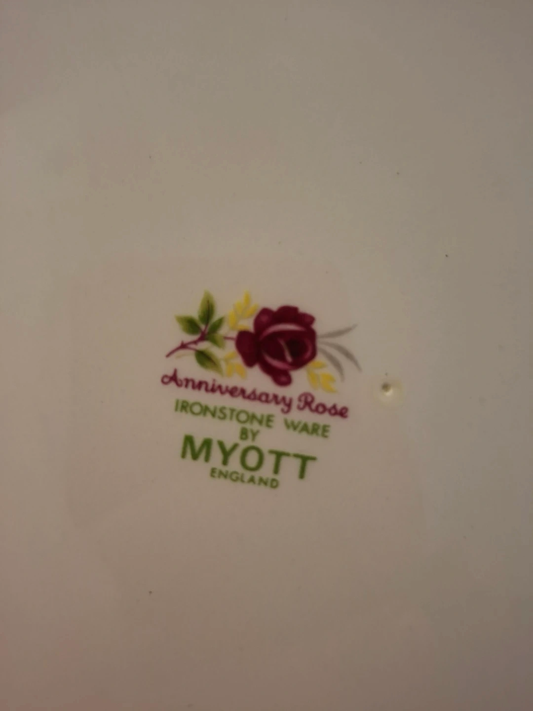 This Myott "Anniversary Rose" Ironstone Ware set features a beautiful rose pattern with gold trim. It includes cups, saucers, plates, and a large serving platter. This vintage china would be lovely for special occasions or everyday elegance!