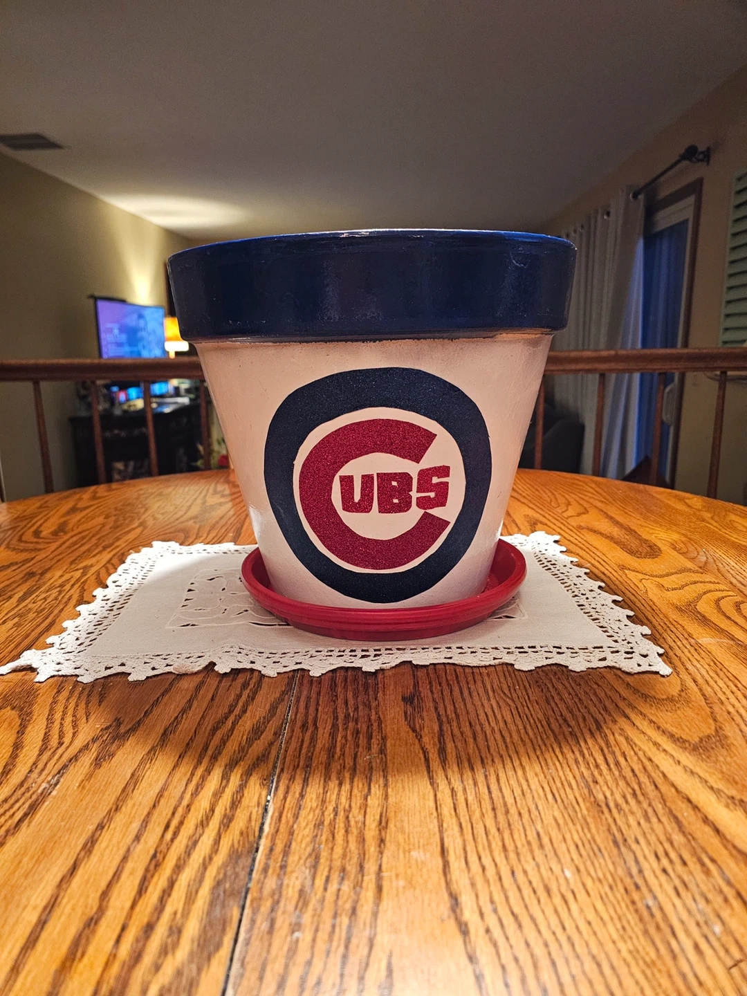 Decorative flower pots featuring Chicago sports teams sold separately ($35 each). One pot has the Chicago Bears logo and colors. The other pot displays the Chicago Cubs logo. Perfect for displaying plants or as a fan collectible! Support your favorite team!
