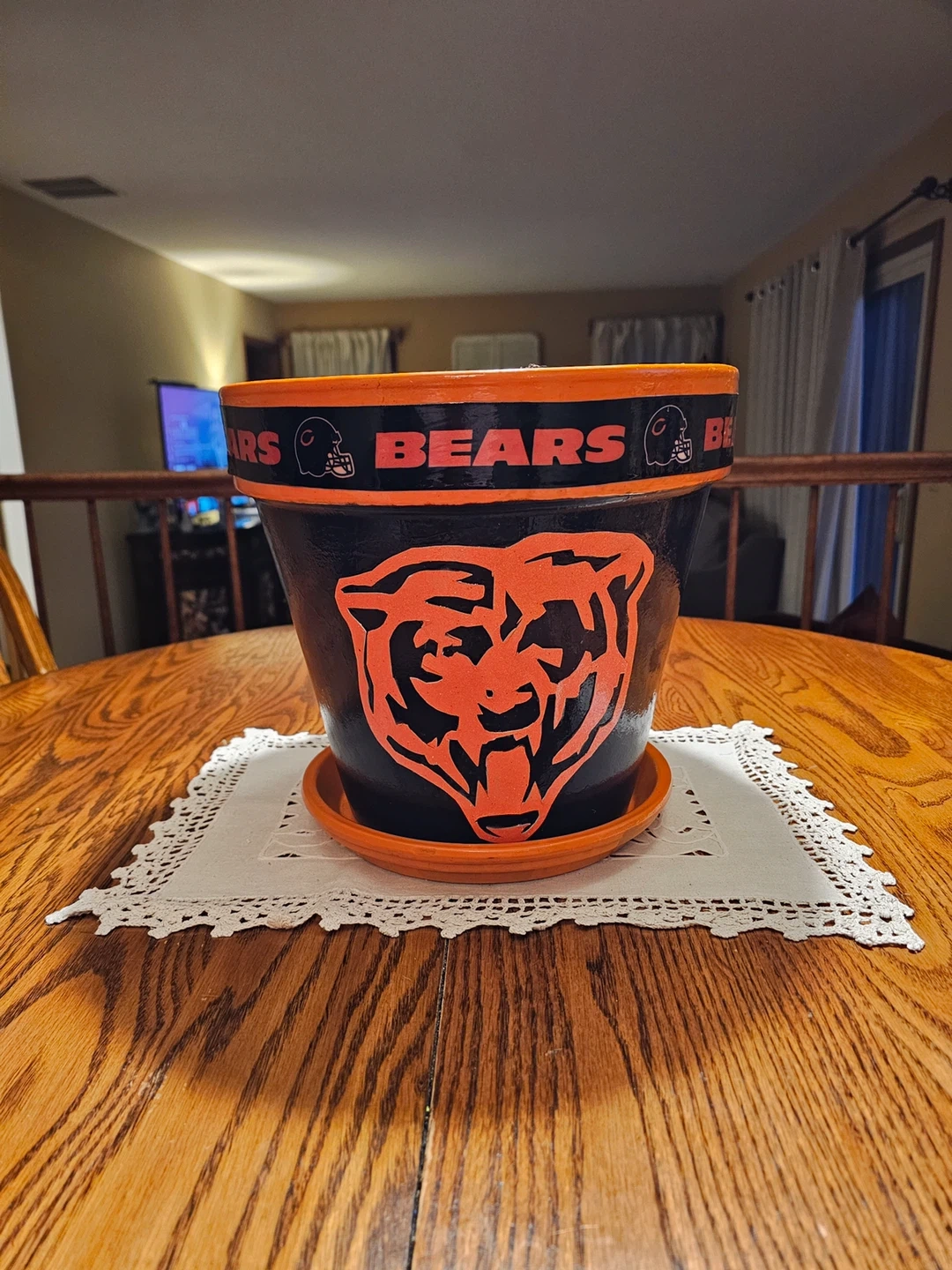 Decorative flower pots featuring Chicago sports teams sold separately ($35 each). One pot has the Chicago Bears logo and colors. The other pot displays the Chicago Cubs logo. Perfect for displaying plants or as a fan collectible! Support your favorite team!