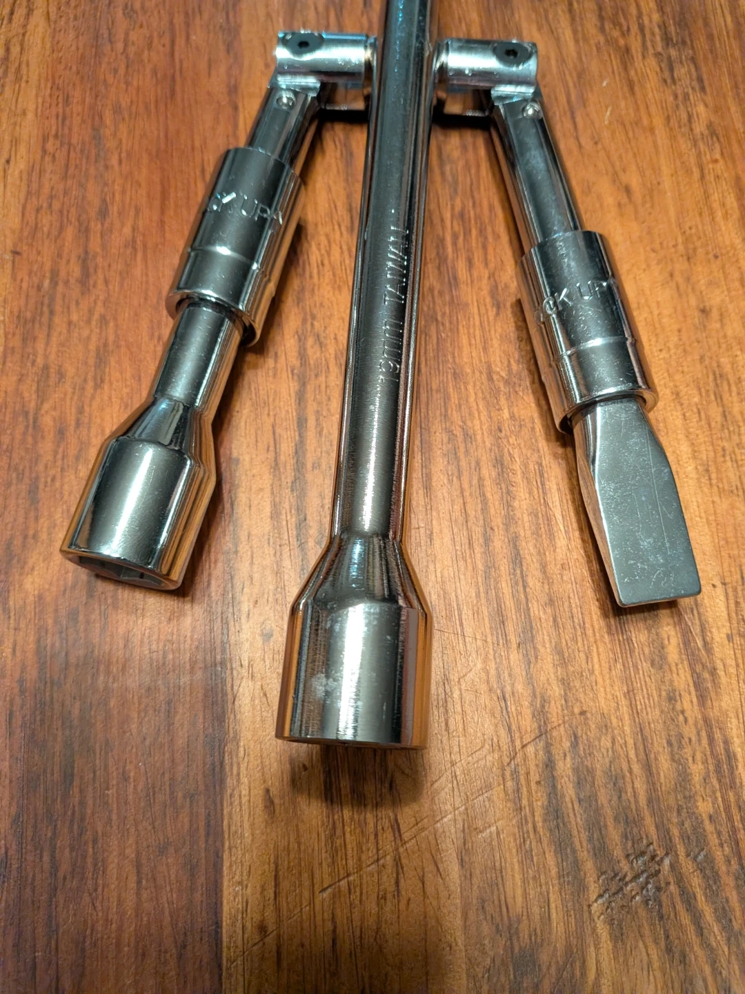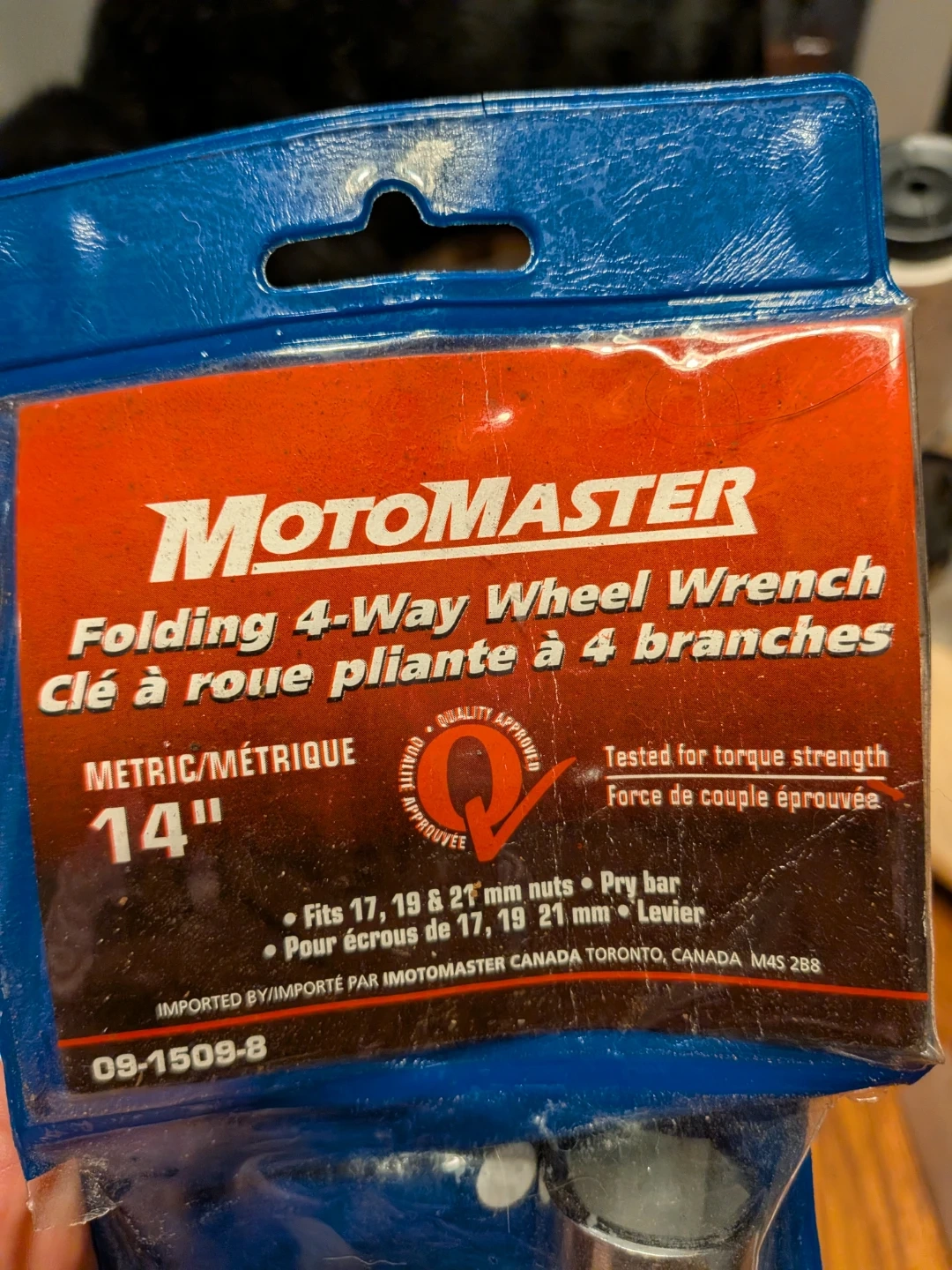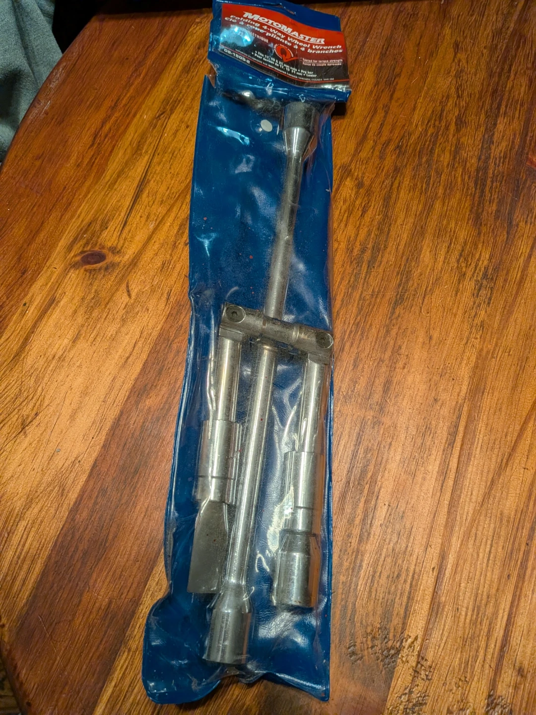 Selling a MotoMaster folding 4-way wheel wrench. It's a 14" wrench that fits 17, 19, and 21 mm nuts. Also works as a pry bar!