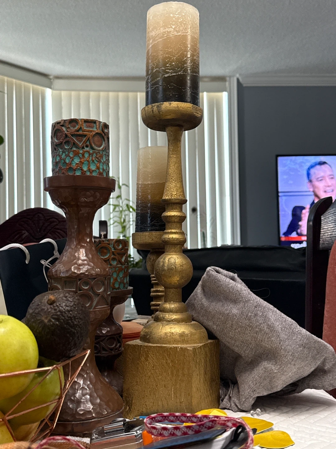This set includes three decorative candlesticks. One is a tall, ornate gold-coloured candlestick with a layered candle. Another is a shorter copper-coloured candlestick with intricate patterns and a textured candle. The third is a copper-coloured candlestick with a detailed geometric design. They're made of metal and add a rustic, elegant touch to any space.