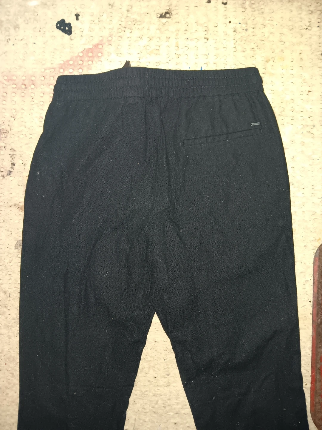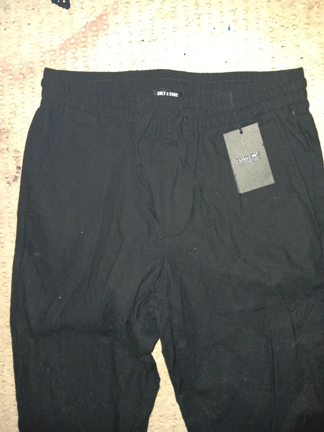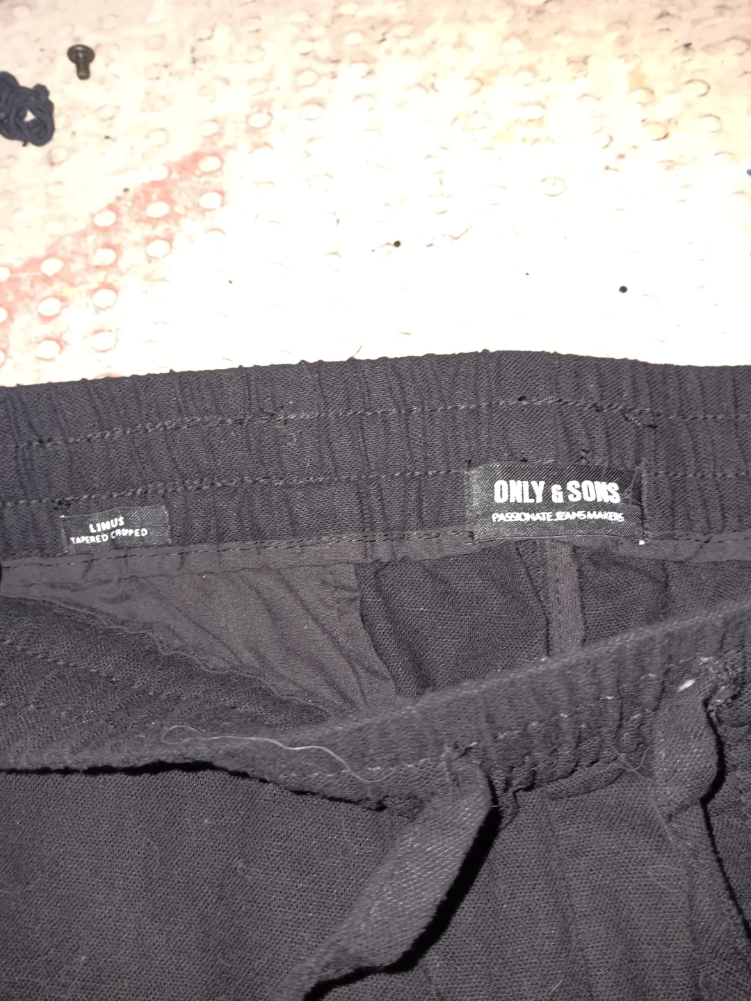 These are black tapered cropped pants from Only & Sons. They have an elastic waistband with a drawstring closure. Made with a cotton blend for comfort. Super comfortable, mens, tapered, linen pants.