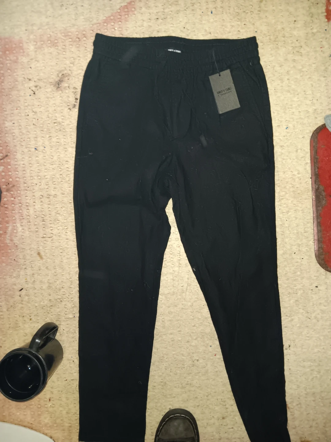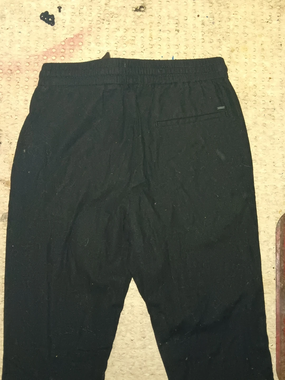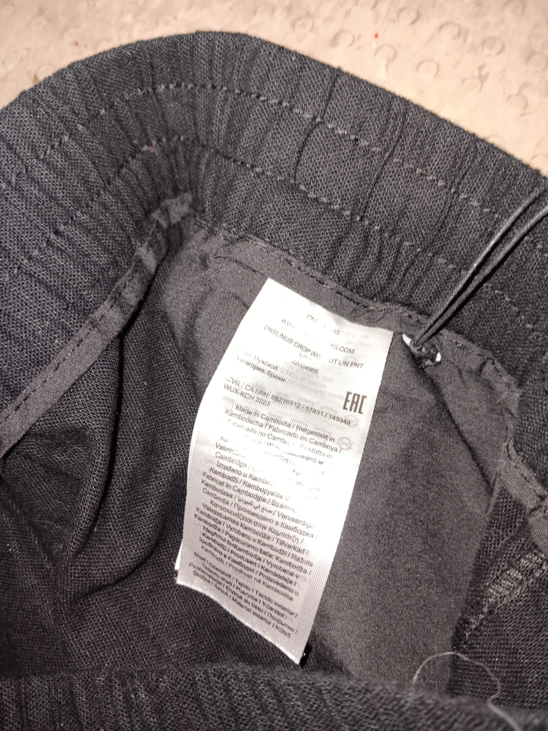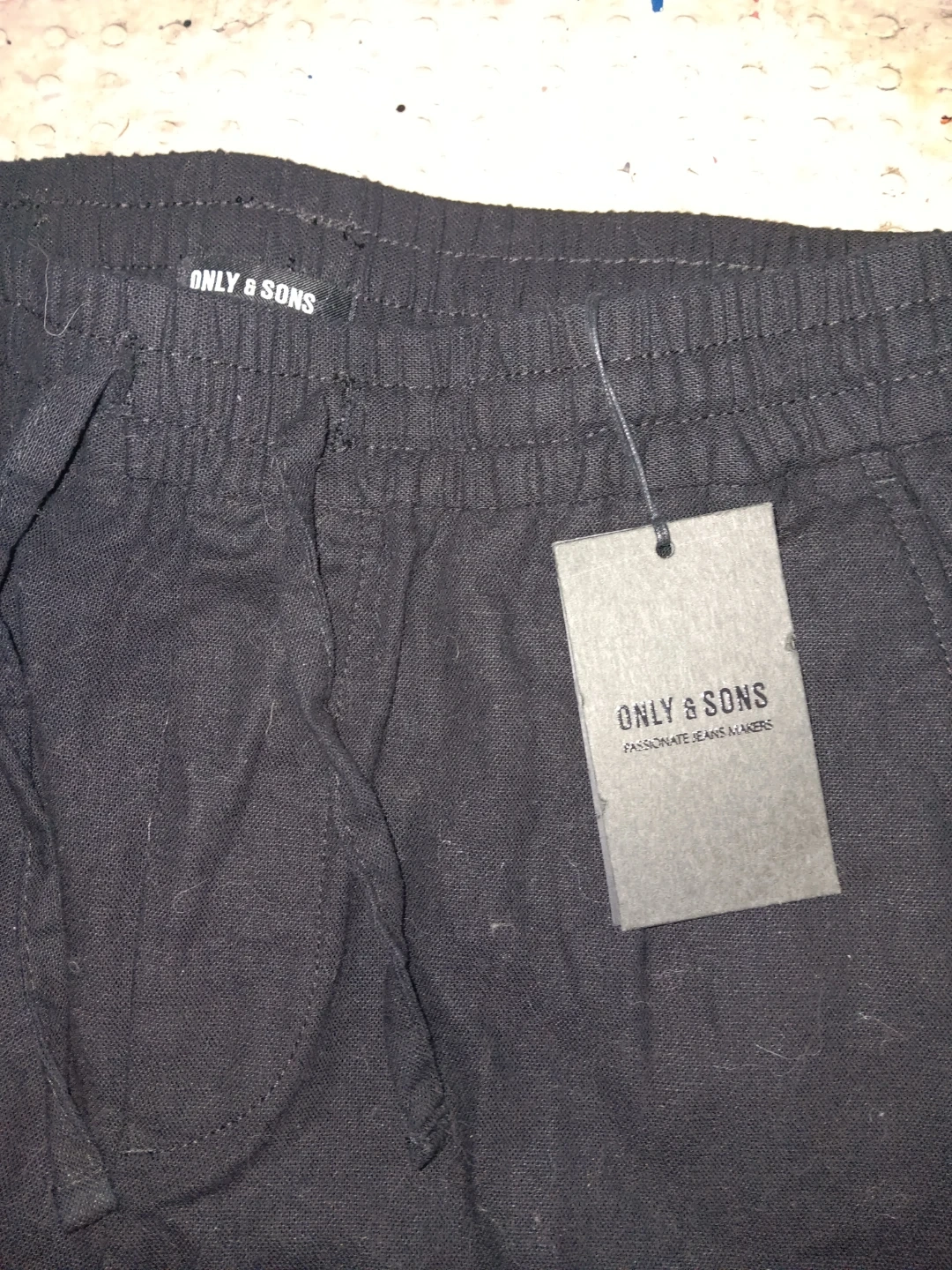 These are black tapered cropped pants from Only & Sons. They have an elastic waistband with a drawstring closure. Made with a cotton blend for comfort. Super comfortable, mens, tapered, linen pants.