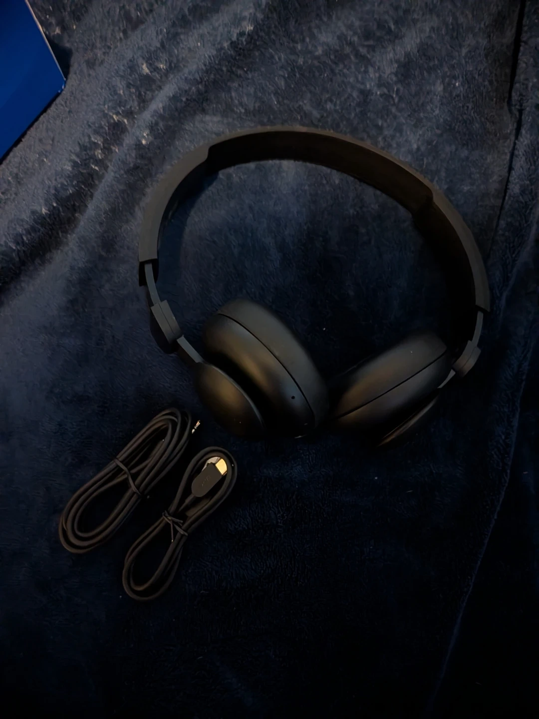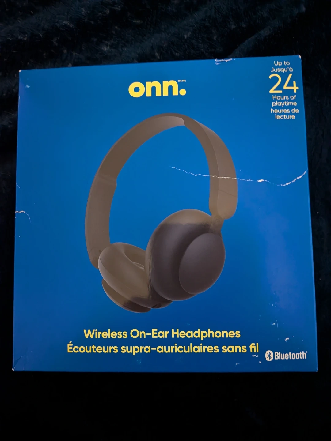 Selling a pair of onn. wireless on-ear headphones in black. They come with the original box and include a 3.9 ft/1.2 m Aux cable, a USB-C charging cable, and a quick start guide. These headphones offer up to 24 hours of playtime and have a lightweight, collapsible design for easy storage