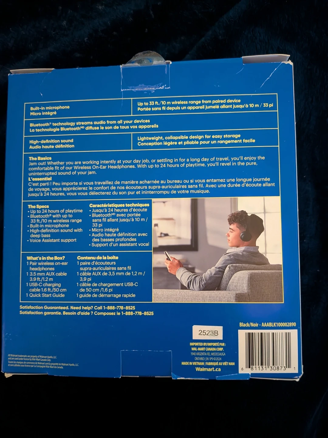 Selling a pair of onn. wireless on-ear headphones in black. They come with the original box and include a 3.9 ft/1.2 m Aux cable, a USB-C charging cable, and a quick start guide. These headphones offer up to 24 hours of playtime and have a lightweight, collapsible design for easy storage