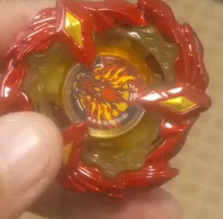 This is a red and yellow Beyblade Burst Valtryek V2. It's a top for competitive play. It's red with yellow accents and a clear middle.