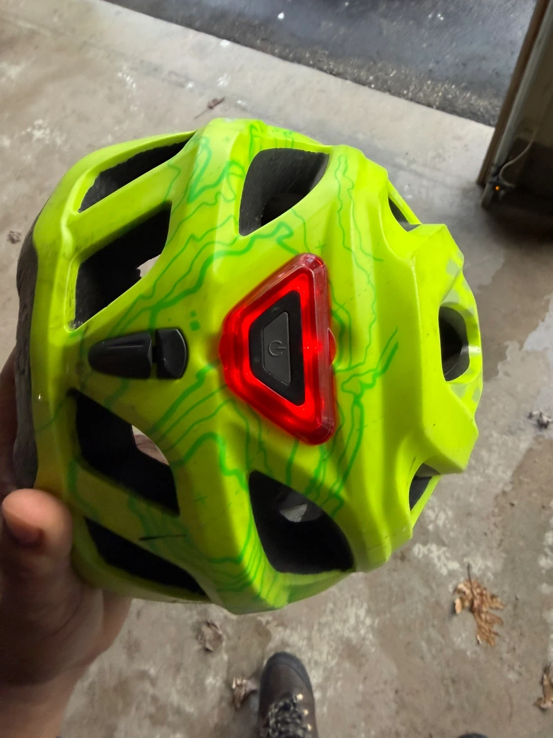 This Raleigh bike helmet is a bright lime green with a cool topographic design. It's equipped with an integrated red rear safety light for increased visibility. Multiple vents help keep you cool on your rides.