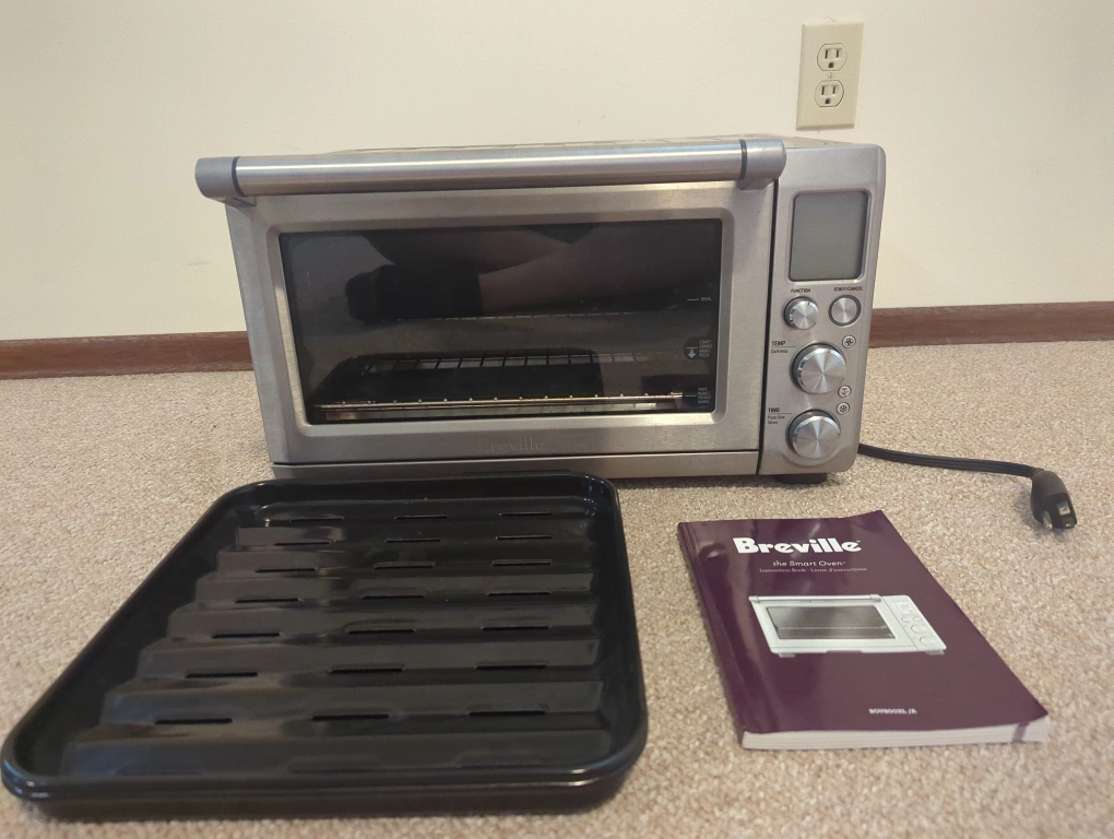 A Breville Smart Oven. Includes a broil tray, baking pan, and the instruction booklet. Any great addition for making quick and easy meals at home.