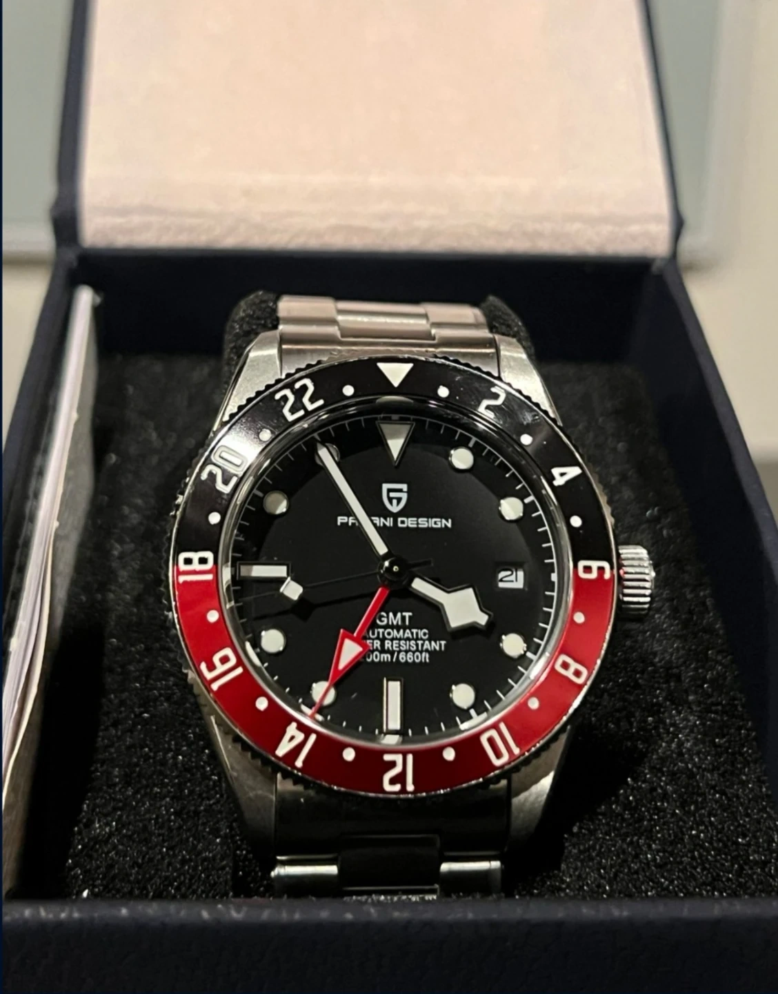Pagani Design GMT automatic watch with a black dial and red/black bezel. It's water resistant to 200m/660ft. This watch is in its original box.