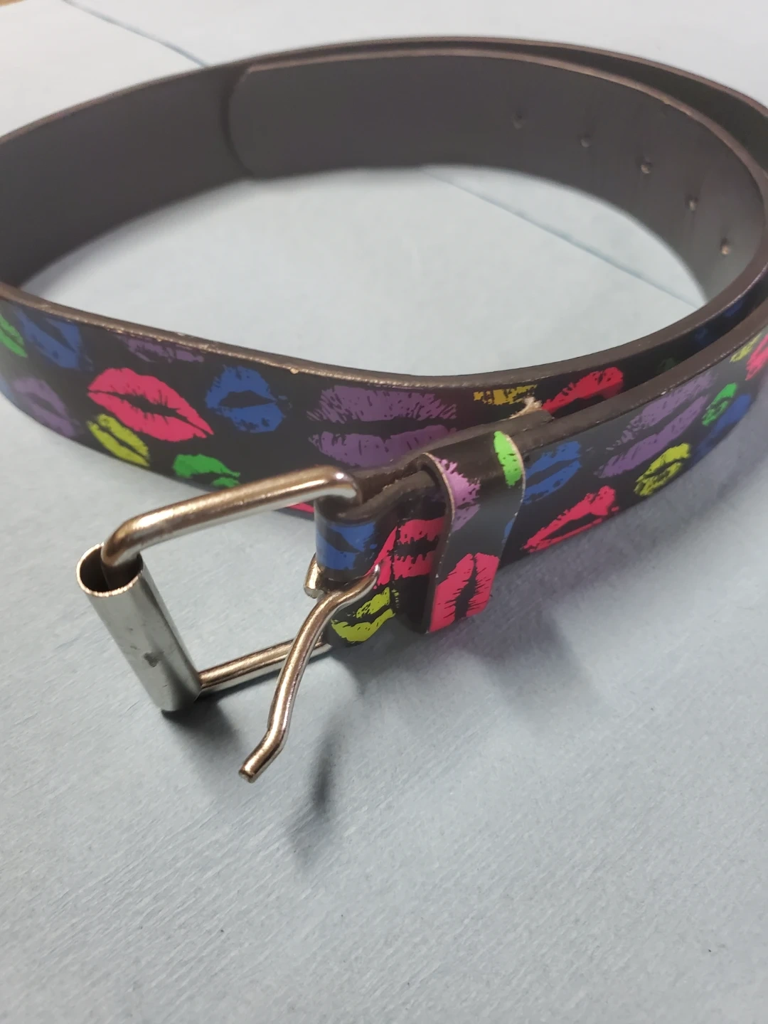 This belt features a fun print of colourful lips. It has a classic silver buckle closure. A great accessory to add a pop of colour to any outfit!