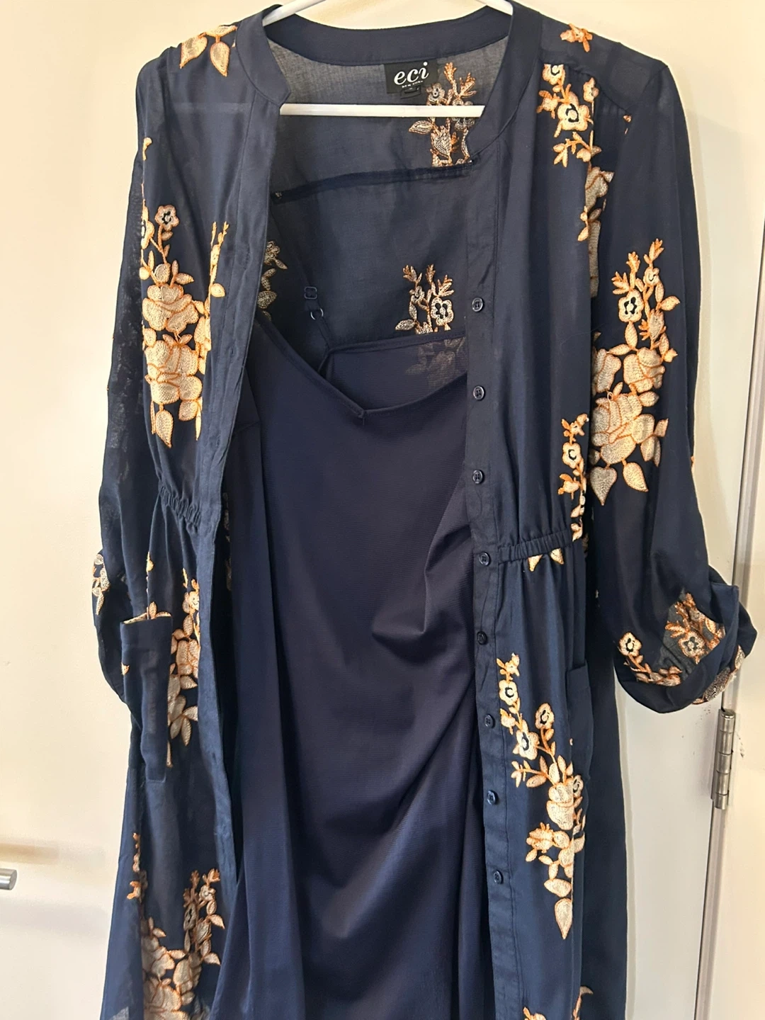 This is a lovely navy blue dress from ECI New York. It features beautiful floral embroidery. It's a size 6 and in great condition!